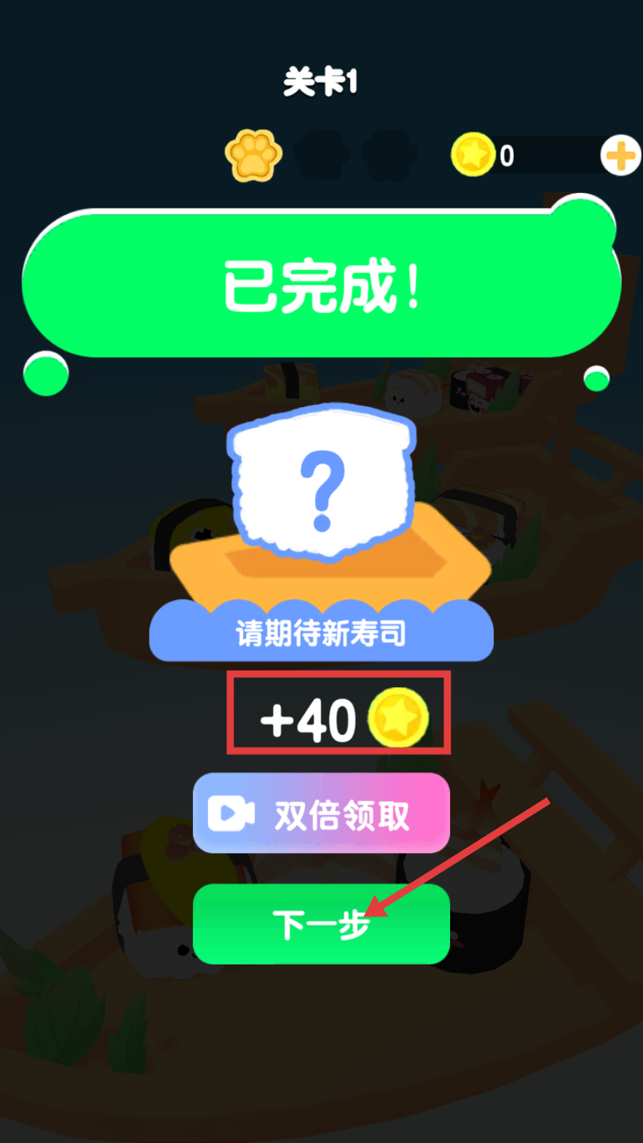 4、通关后领取【+40金币】,点击【下一步】解锁新寿司,也可看视频双倍领取收益。
