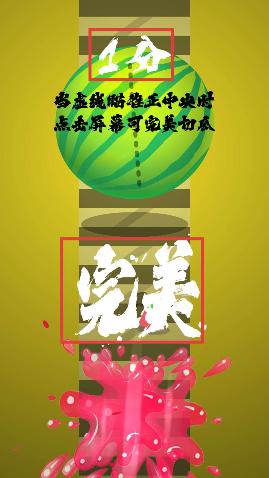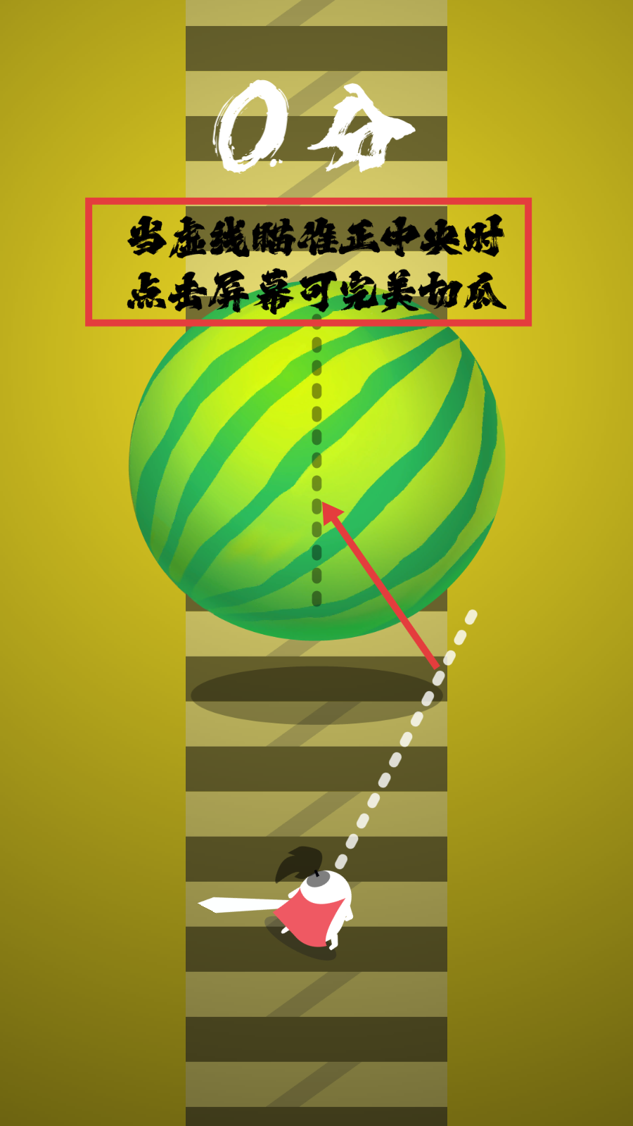 2、切瓜时留意提示,当【虚线瞄准正中央】时点击屏幕,尝试达成完美切瓜。