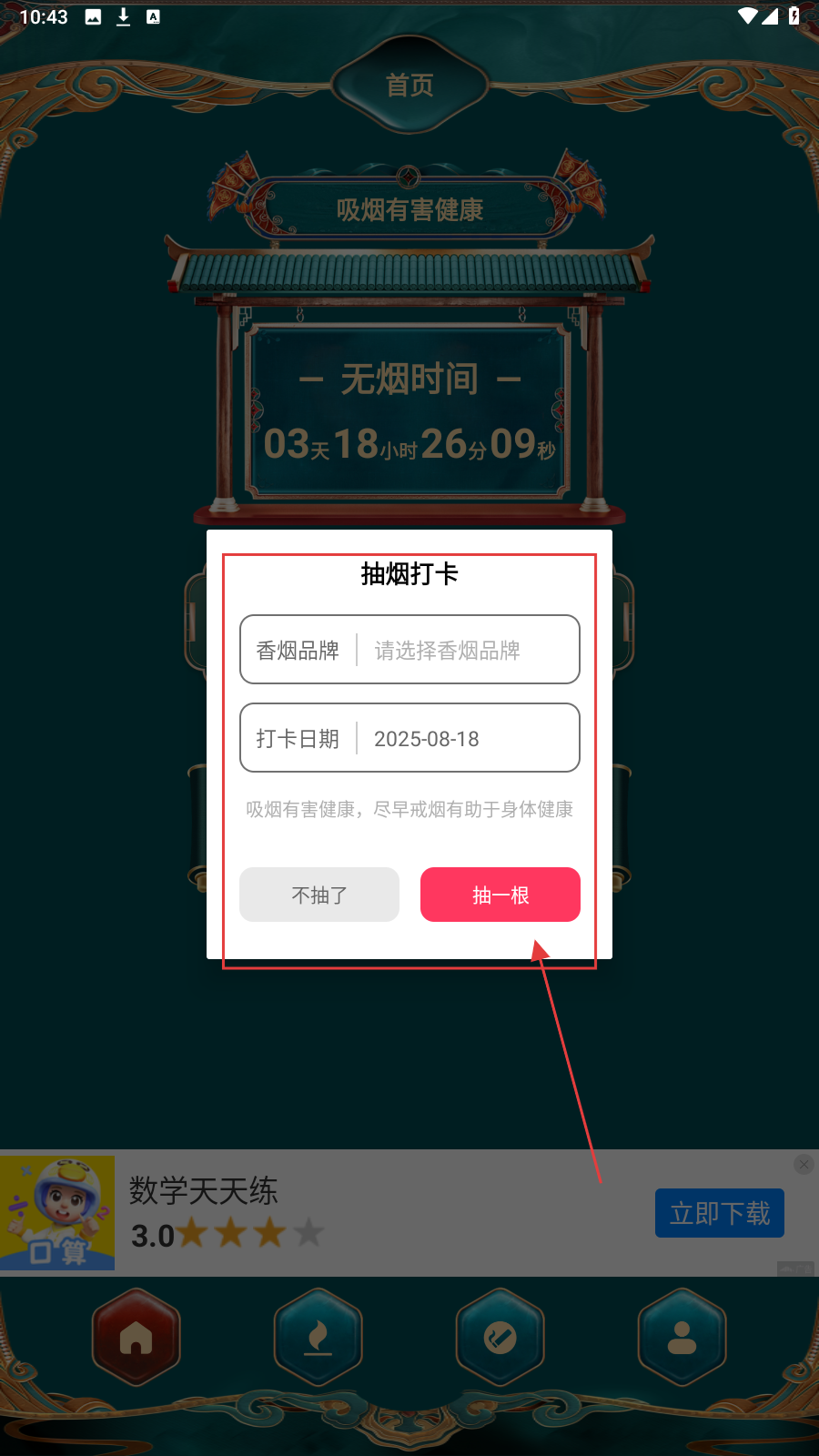 2、点击后,在【抽烟打卡】弹窗中,选择香烟品牌并点击【抽一根】。