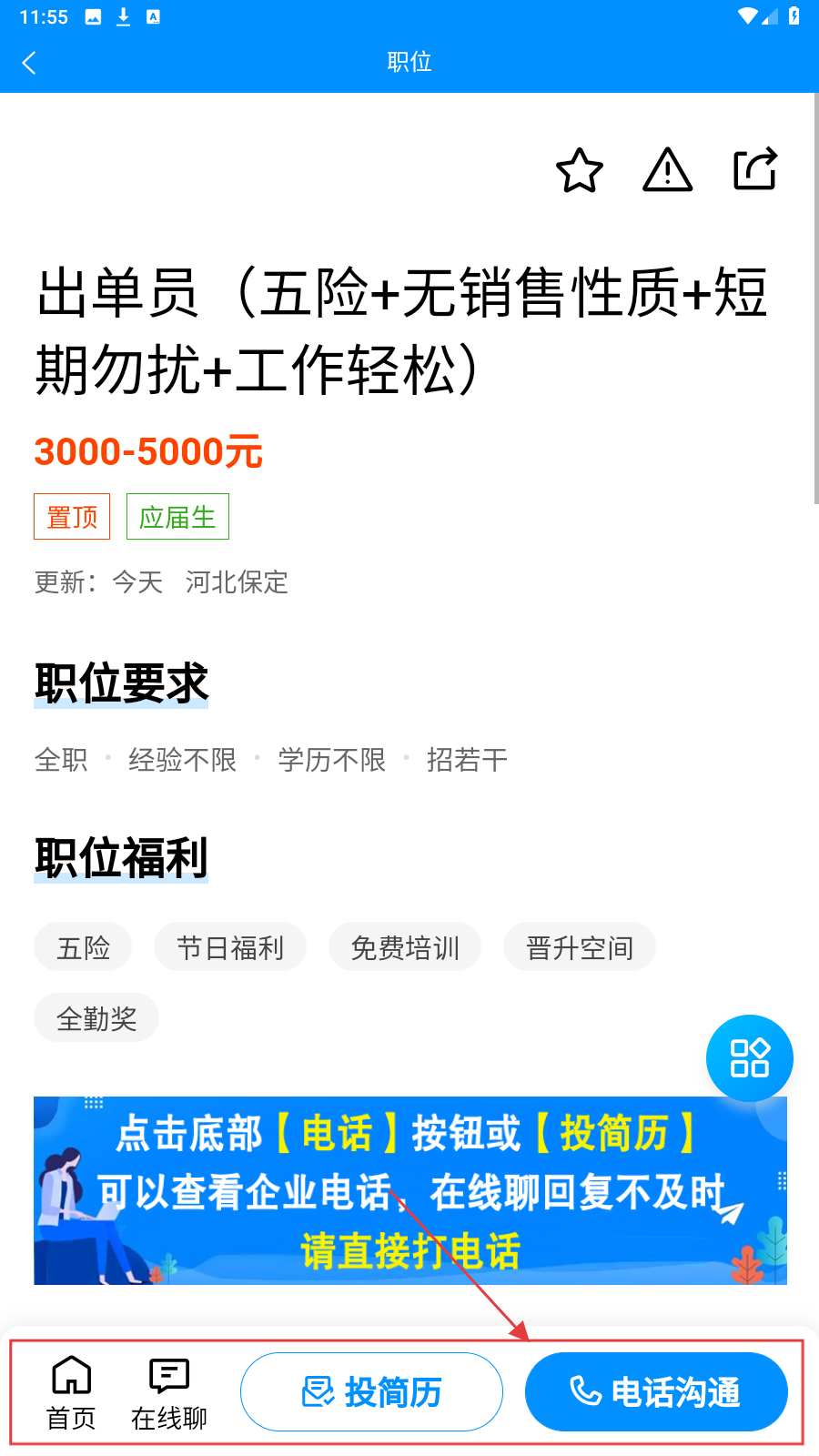 3、查看职位详情时,若满意岗位,点【投简历】或【电话沟通】,高效对接招聘方。