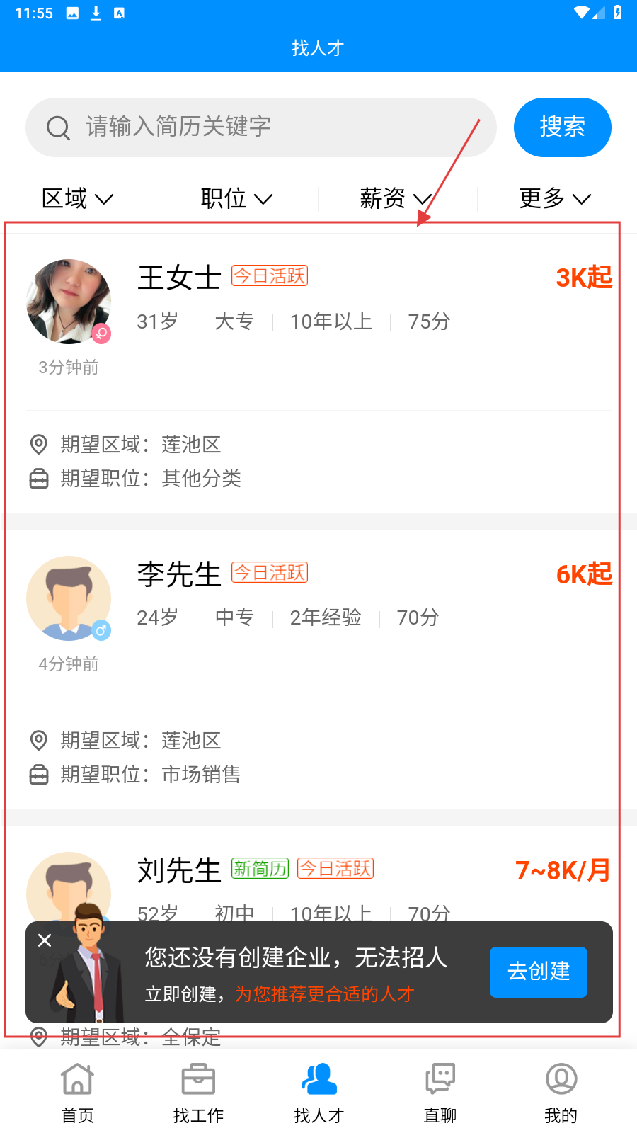 4、切换到【找人才】页,企业可浏览人才信息,无企业先【去创建】,以便招人匹配。