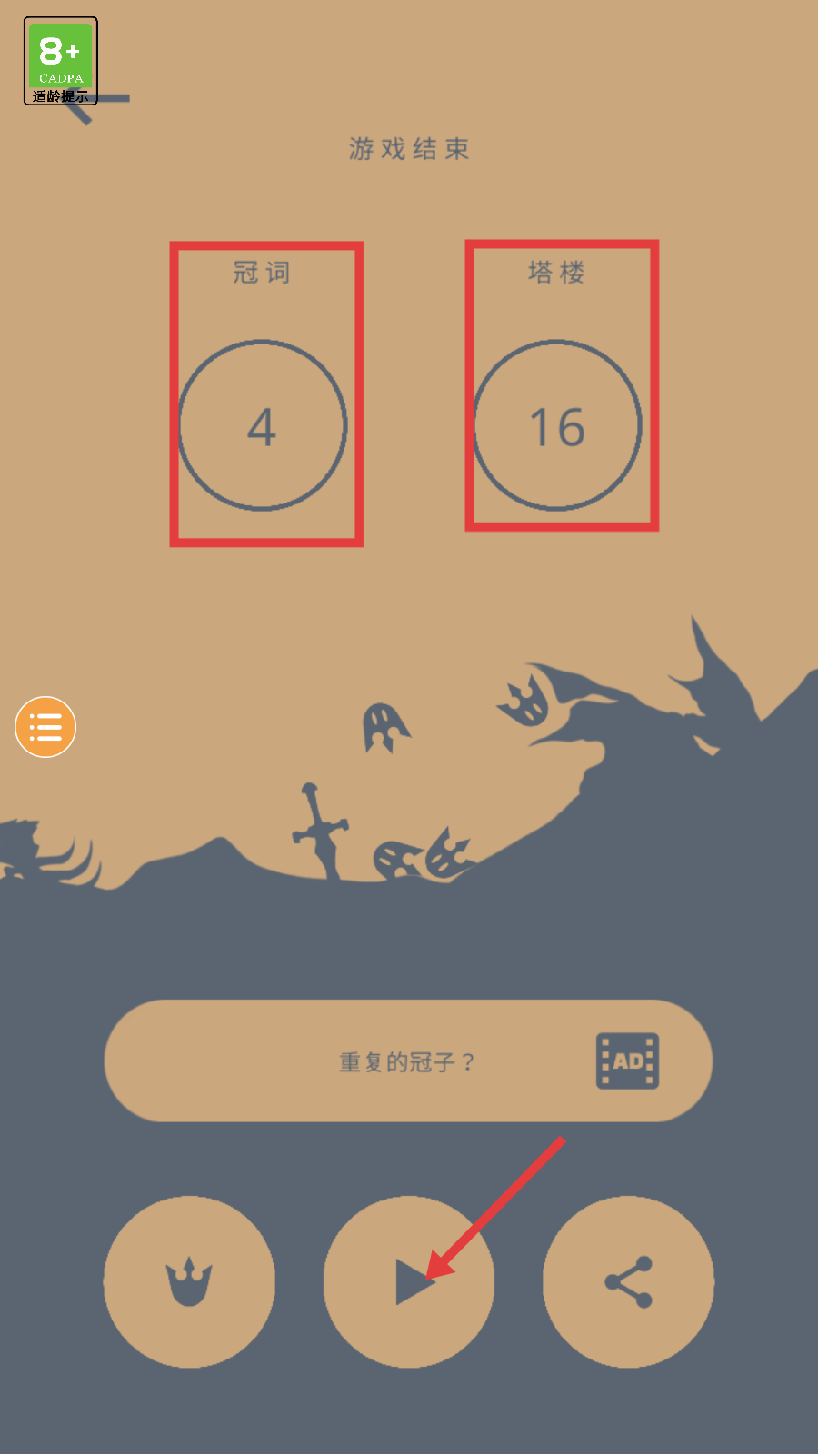 4、游戏结束后,参考【冠词-4】与【塔楼-16】数据,点击中间箭头按钮重启挑战,优化策略突破记录。