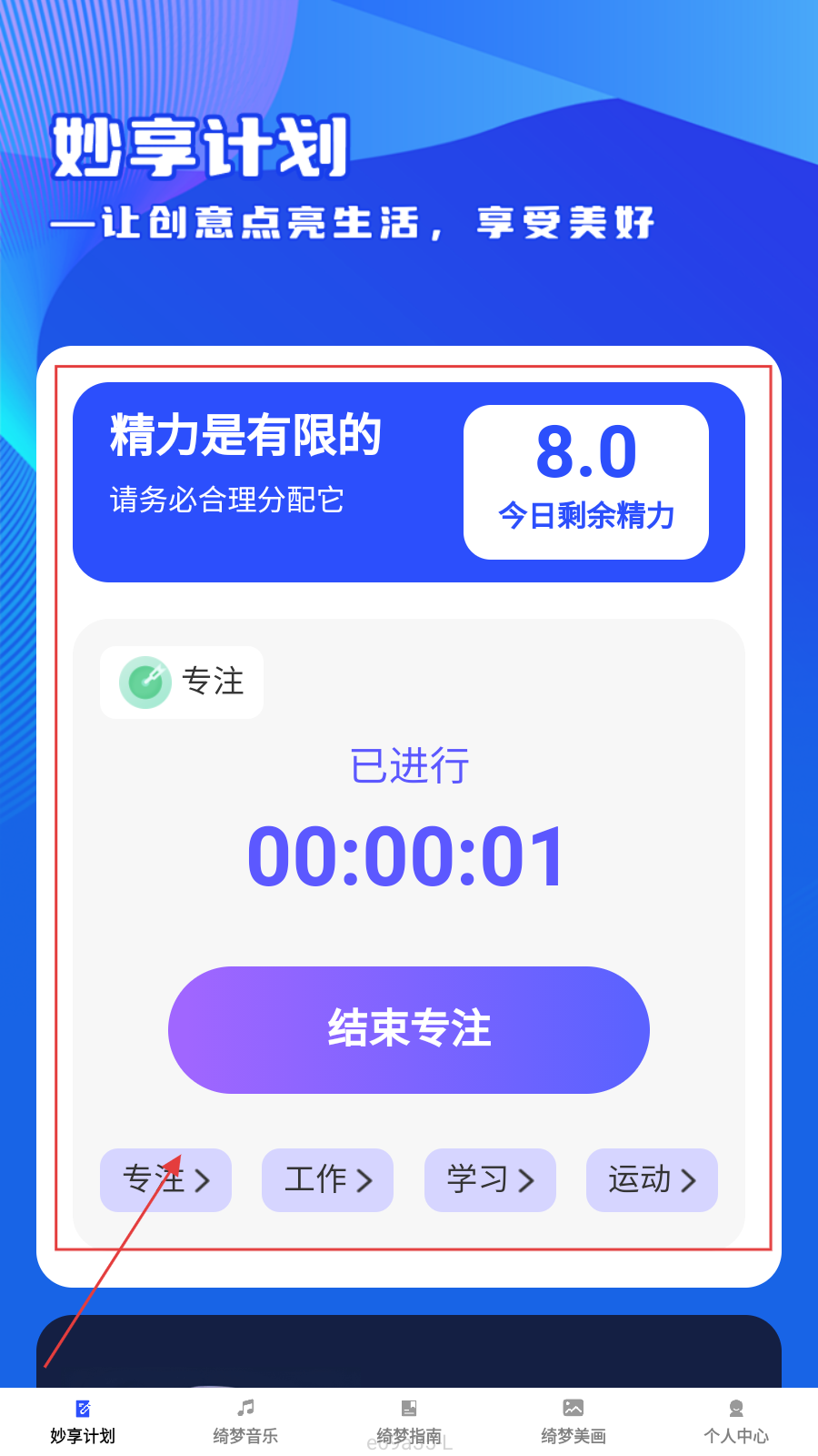 2、在精力页,选任务(如【专注】)点【开始】,按任务类型分配今日精力。