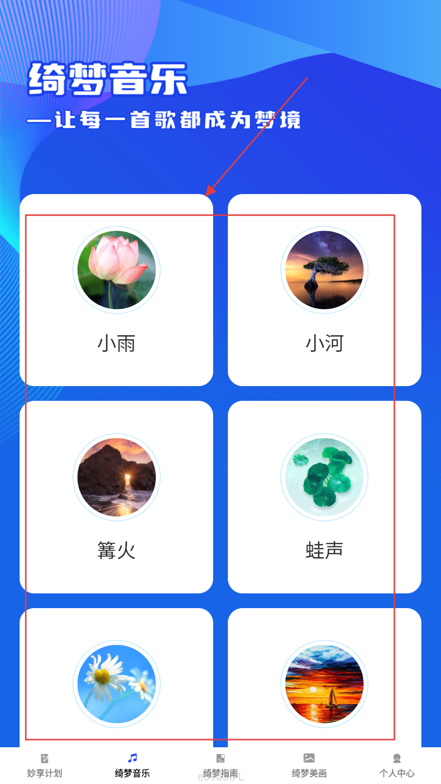 4、切换到【绮梦音乐】,选喜欢的音乐(如【小雨】【小河】),让音乐伴你放松。