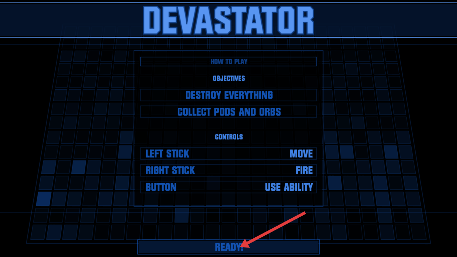 1、查看【HOW-TO-PLAY】熟悉操控,点击【READY】启动游戏,明确【DESTROY-EVERYTHING】等目标。