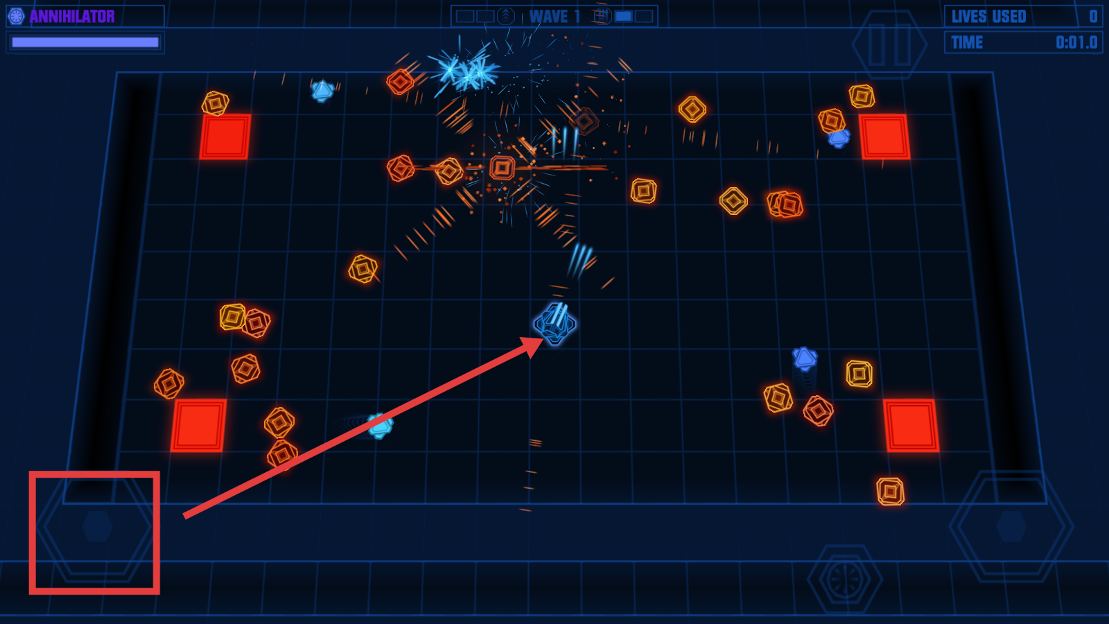 2、Wave-1阶段,用【LEFT-STICK】移动机体,借【RIGHT-STICK】射击,优先清红色方块旁敌人。