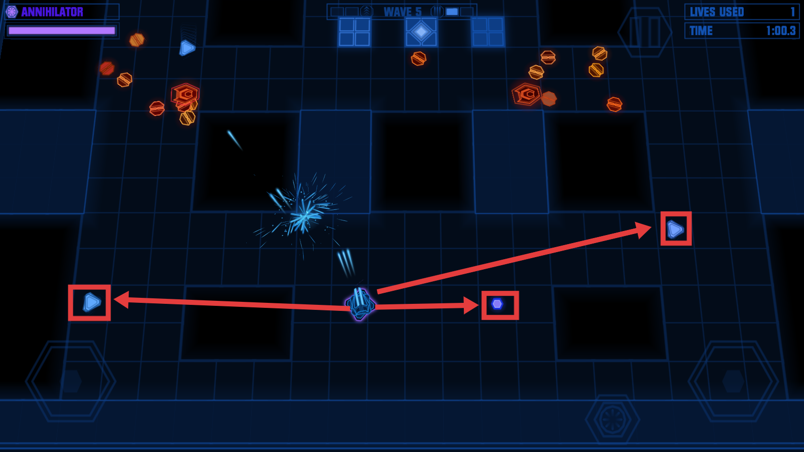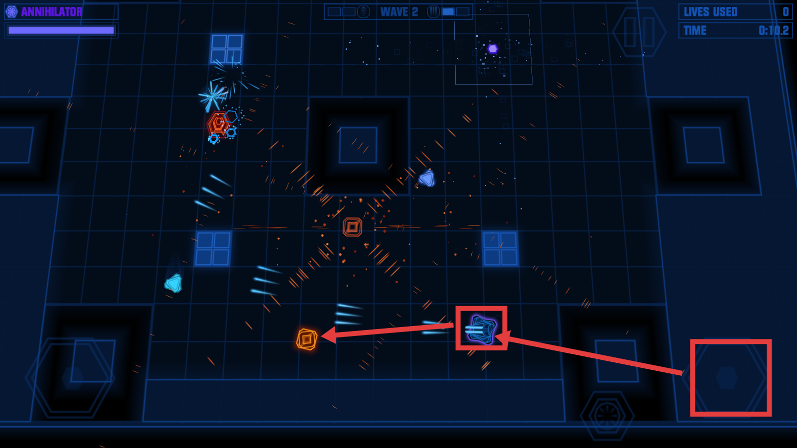 3、Wave-2时瞄准【橙色几何体】攻击,留意角落【六边形区域】,及时获取隐藏资源提升优势。