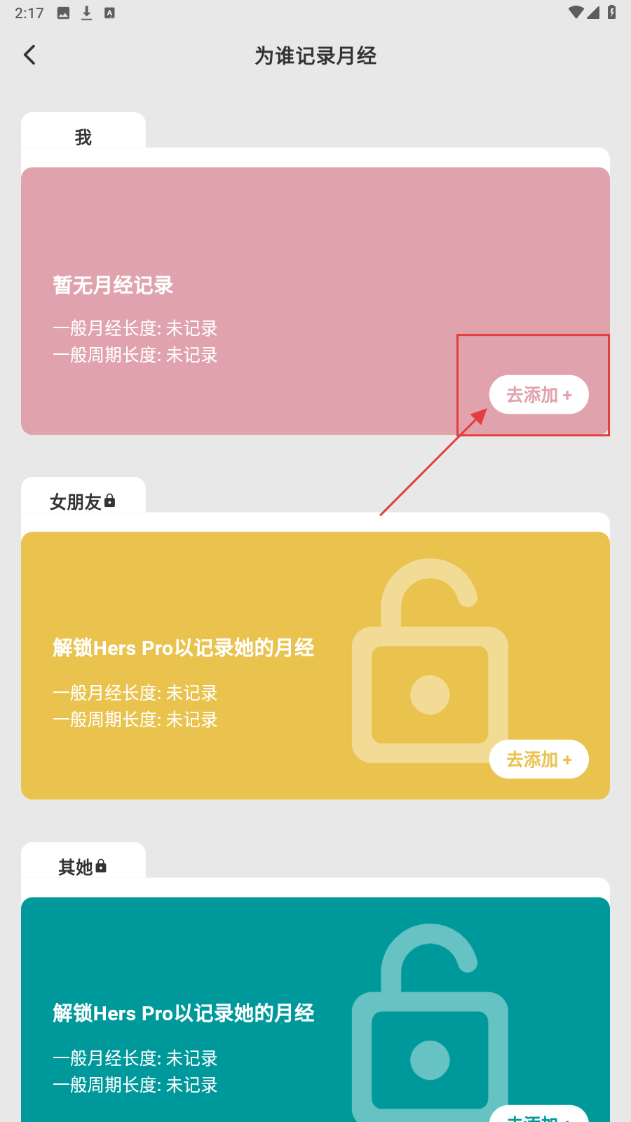 2、选记录对象为【我】,点【去添加+】,开始录入个人经期信息。