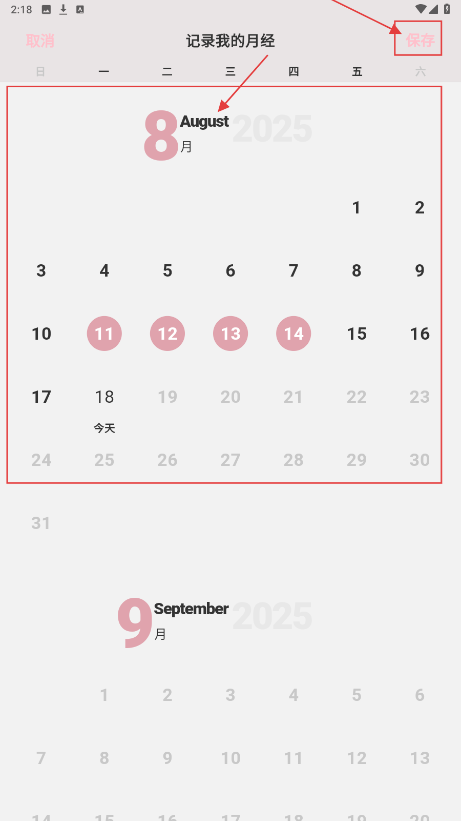3、在日历选经期日期,确认后点【保存】,完成当月经期记录。