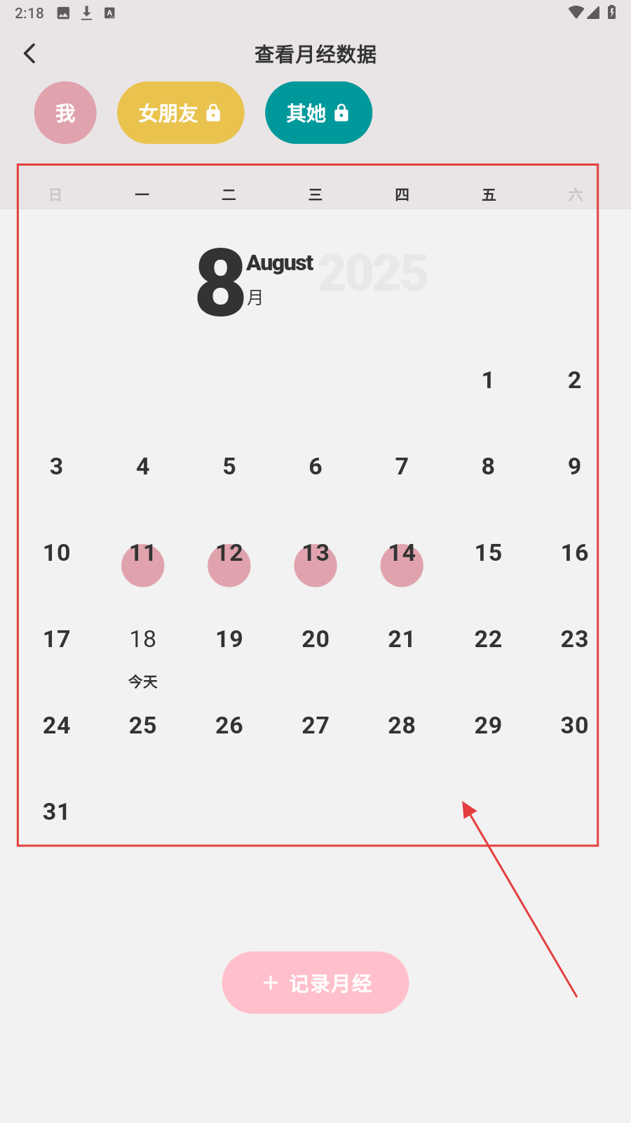 1、进入界面点【+记录月经】,开启记录流程,准备管理经期数据。