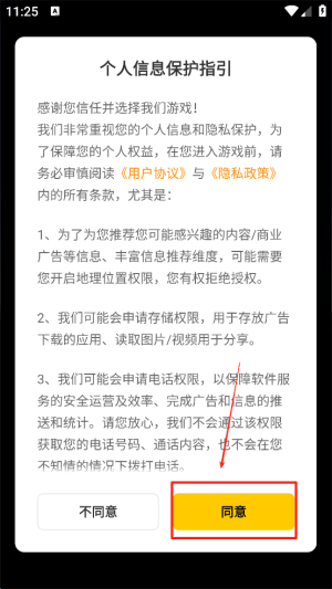 1、同意隐私条款:在游戏开始前,阅读并同意个人信息保护指引,点击“同意”以继续。