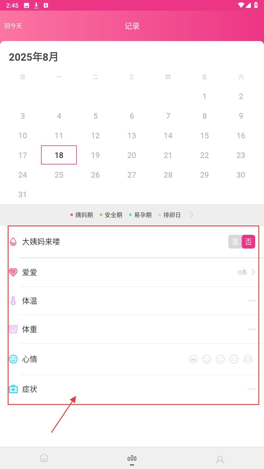 2、进入记录页,选对应日期(如2025年8月18日),开启信息录入。