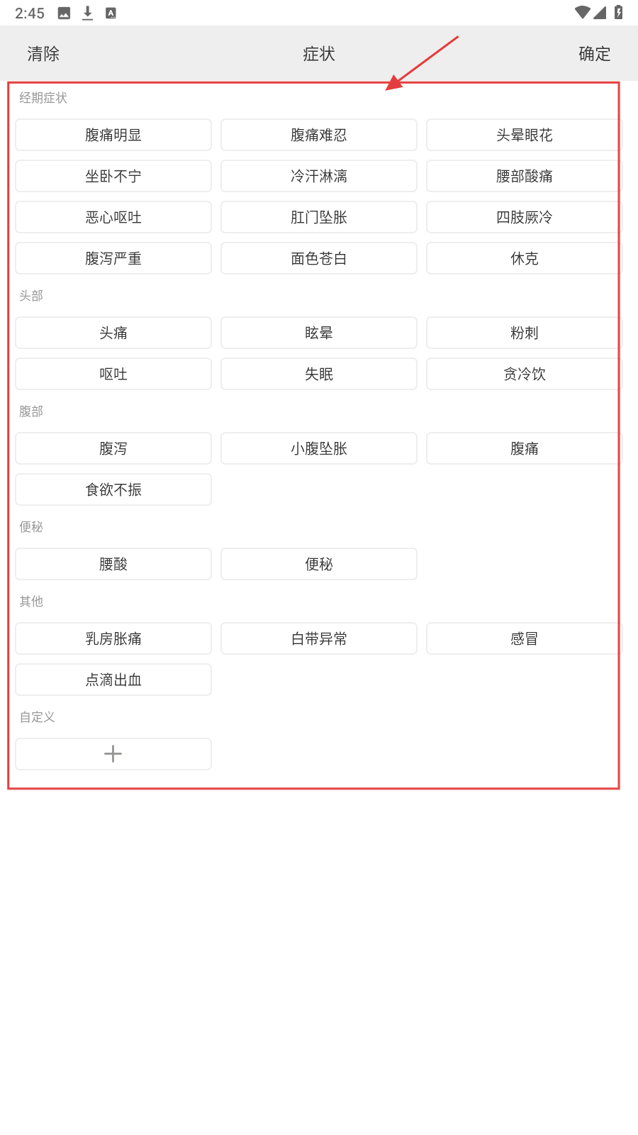 4、点【症状】,选经期不适(如腹痛),完成后点【确定】保存记录。