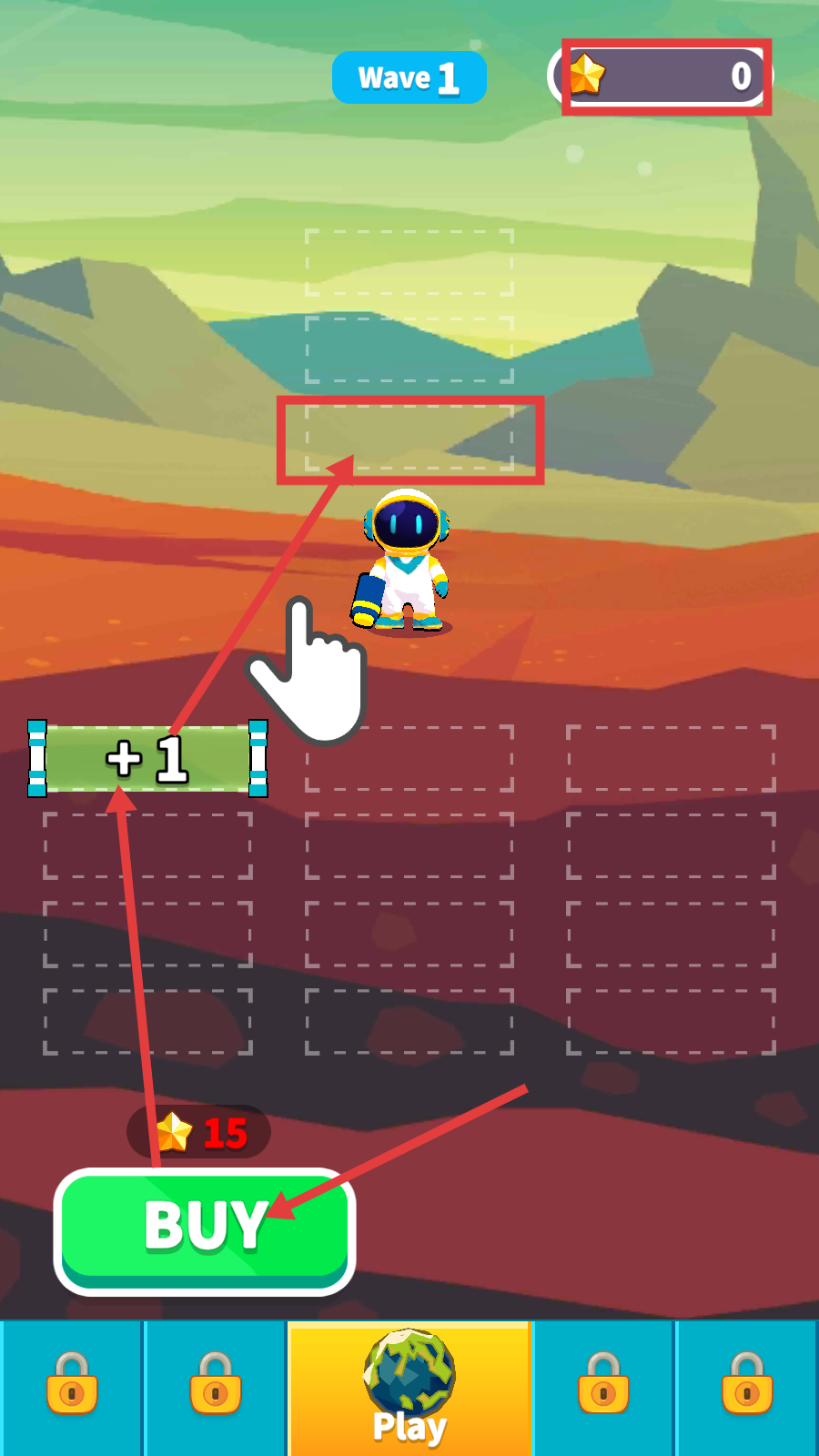 1、Wave-1时消耗【星星-15】点击【BUY】,在空格区域布置单位,启动防御流程。