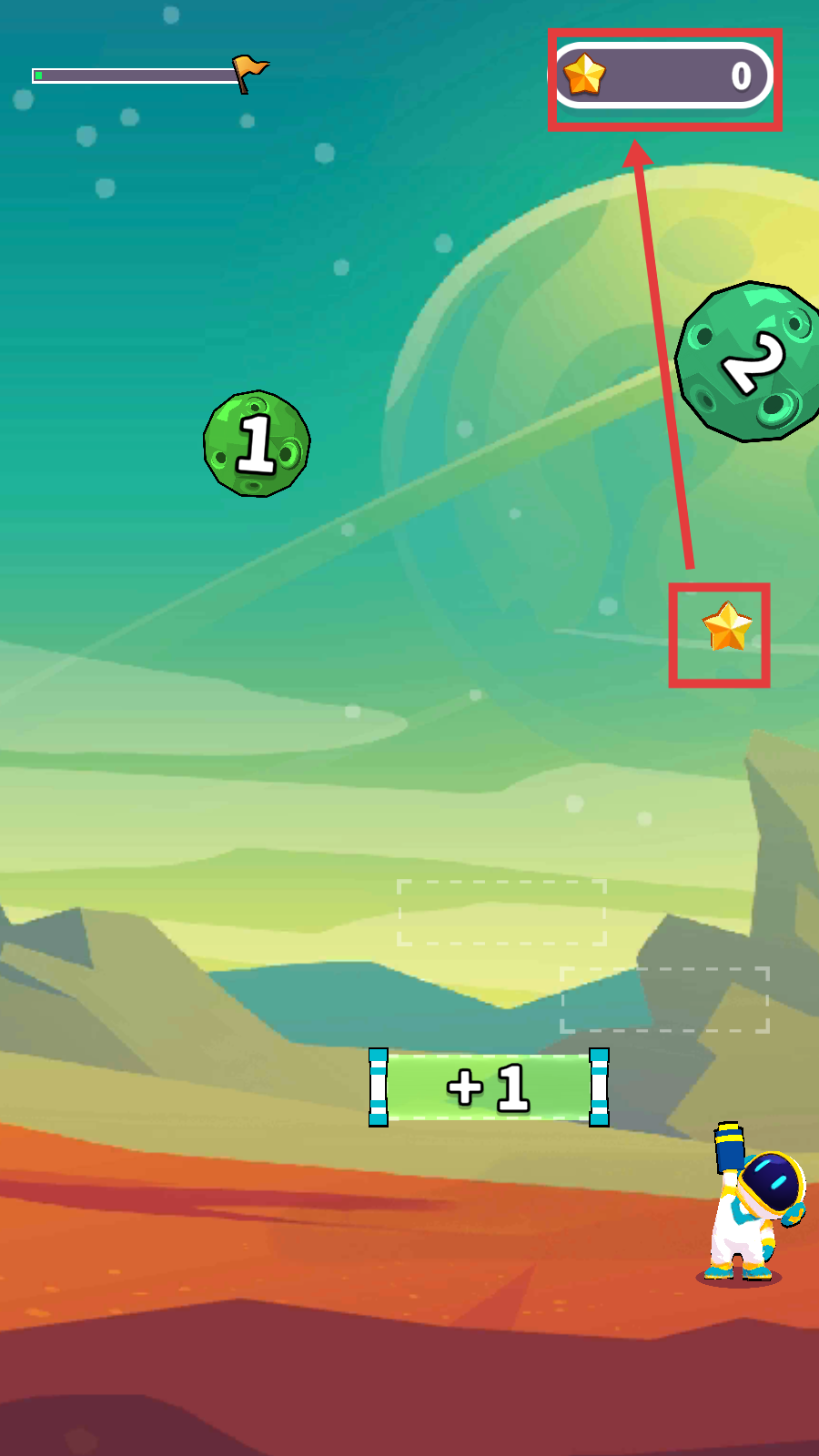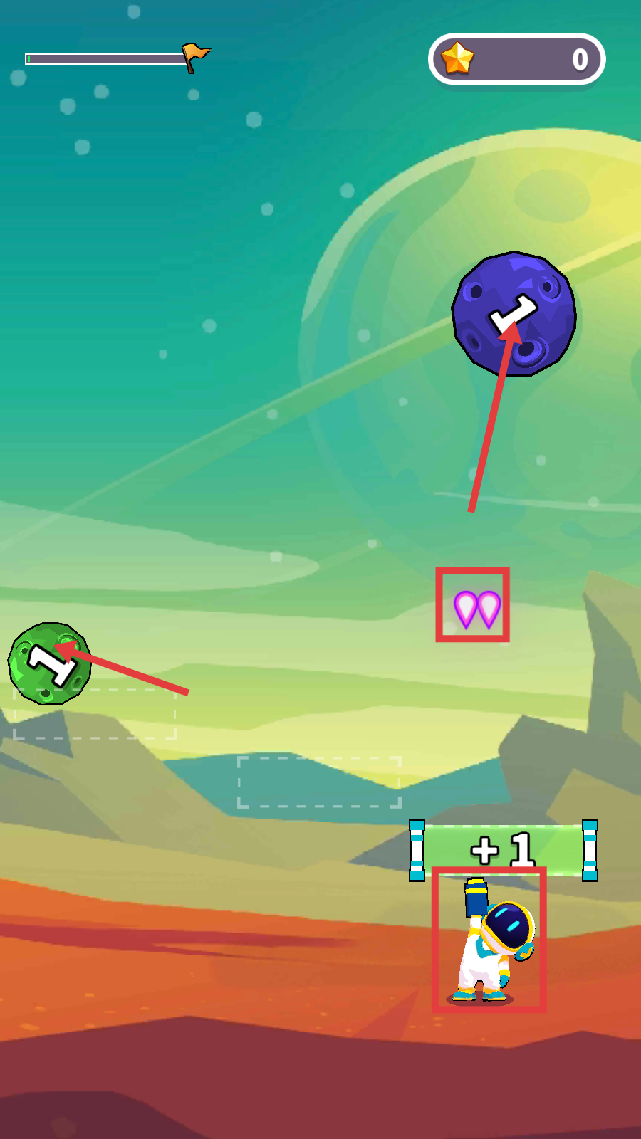 2、操控宇航员发射【紫色爱心】,优先攻击【绿色星球】,提升生存续航能力。