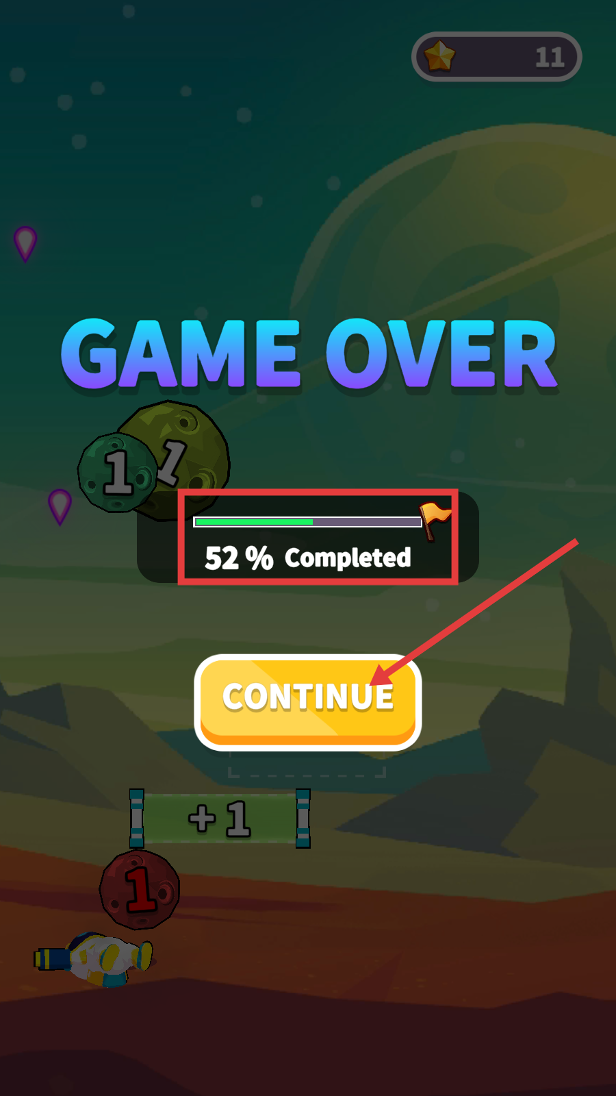 4、游戏结束查看【52%-Completed】进度,点击【CONTINUE】重启,优化攻防策略。