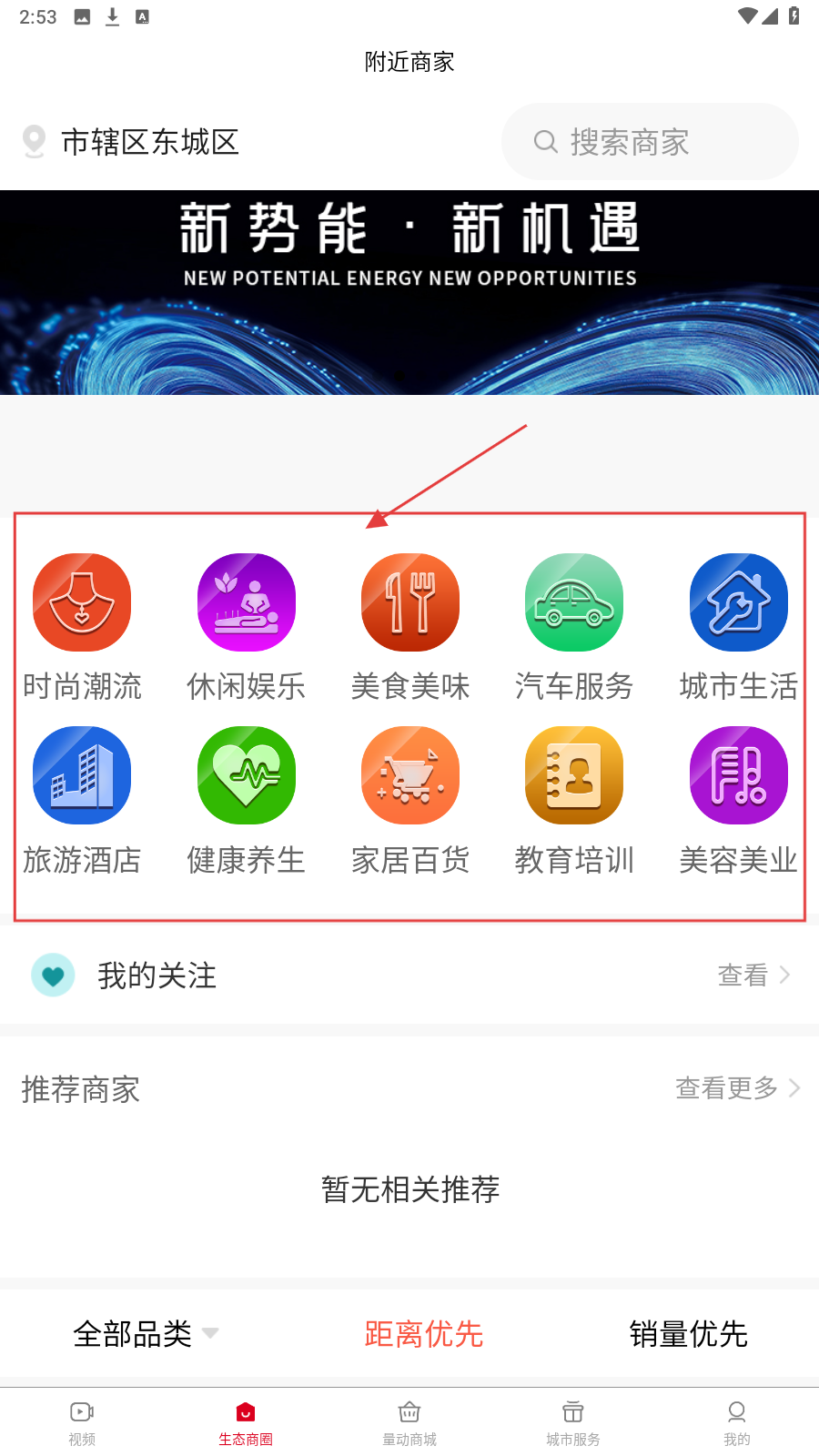 4、切换到【附近商家】,选分类(如美食美味)探索周边商家服务。