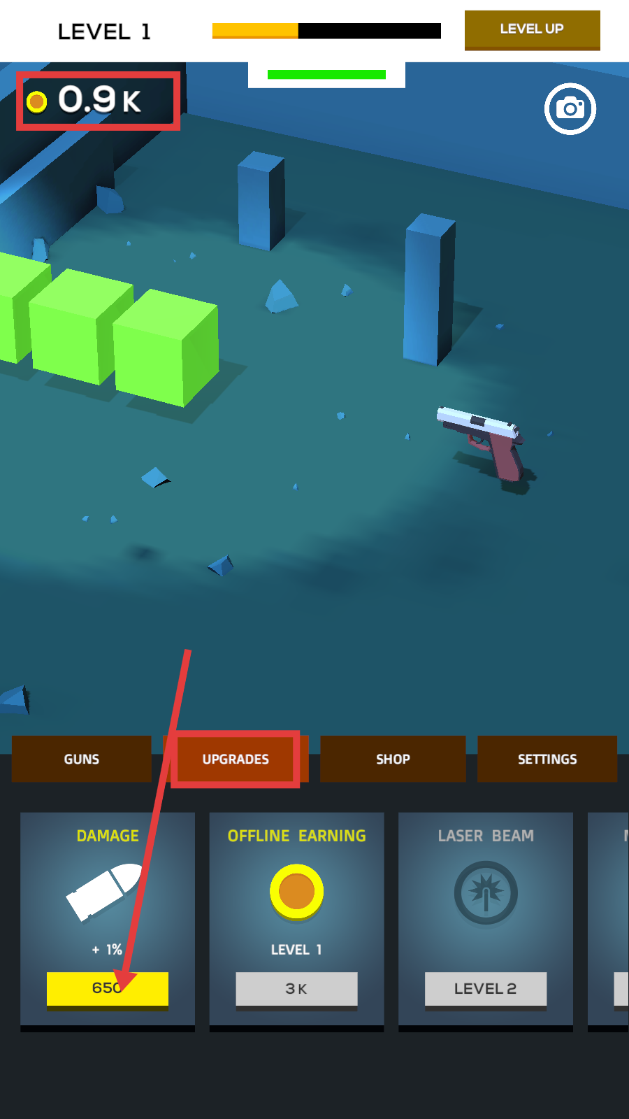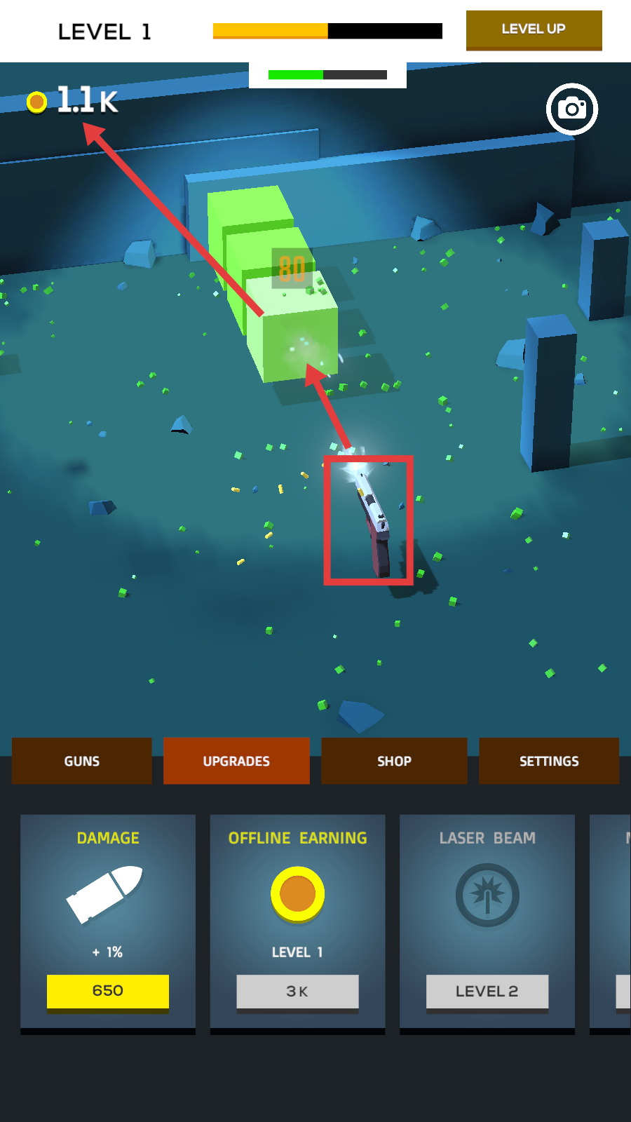 3、战斗中射击绿色方块,击破后收集掉落金币,积累至【1.1k】,为强化提供资源。