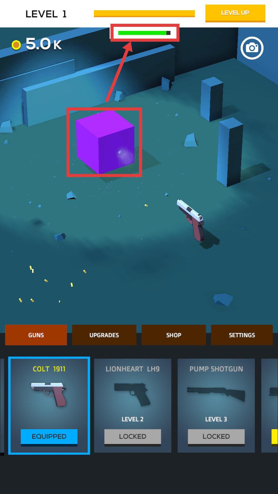 4、优先攻击场景内【紫色方块】,关注上方进度条,推进LEVEL-1关卡的进度解锁奖励。