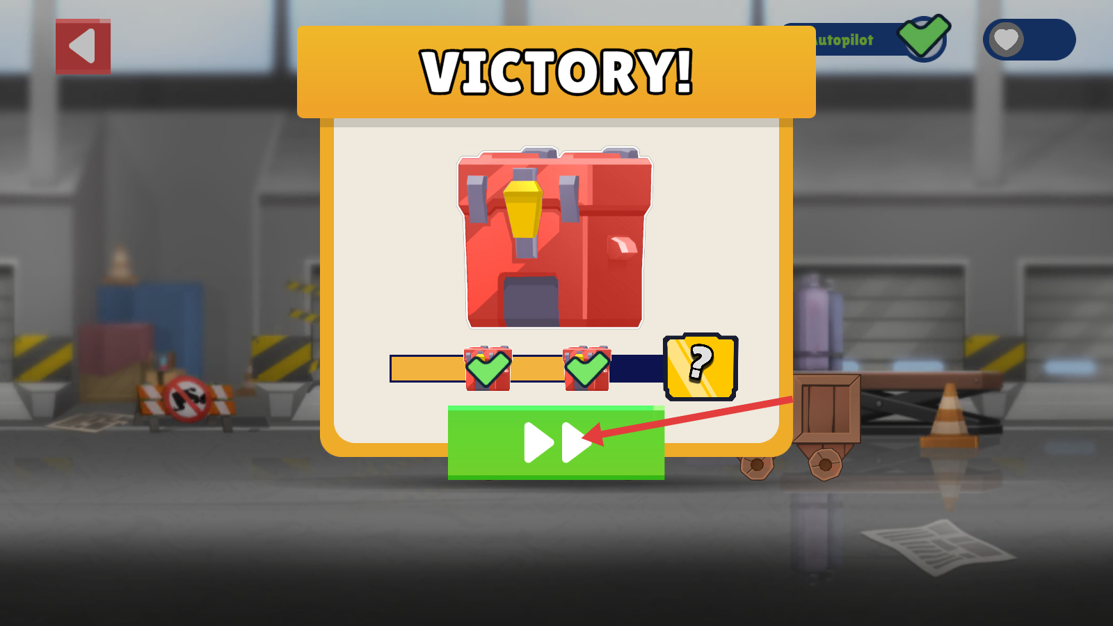 4、获胜后点击绿色箭头按钮,领取【VICTORY】奖励宝箱,推进流程解锁新赛事与装备部件。