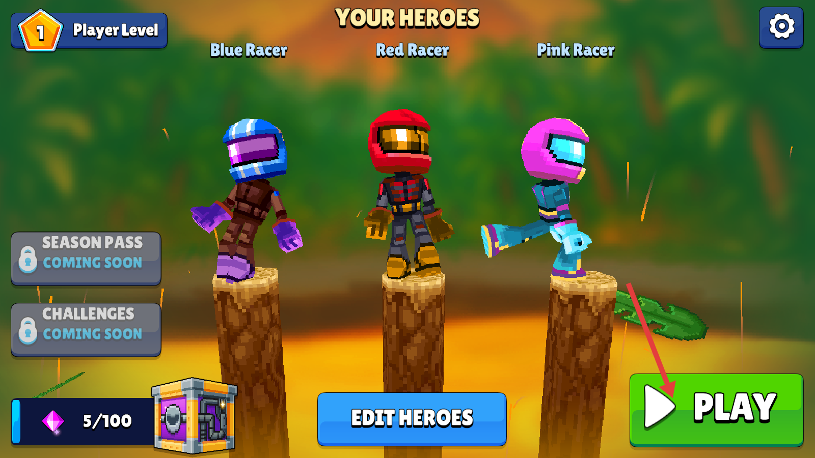 1、在英雄界面选定【Blue-Racer】【Red-Racer】或【Pink-Racer】,点击【PLAY】开启赛事,快速熟悉英雄特性。