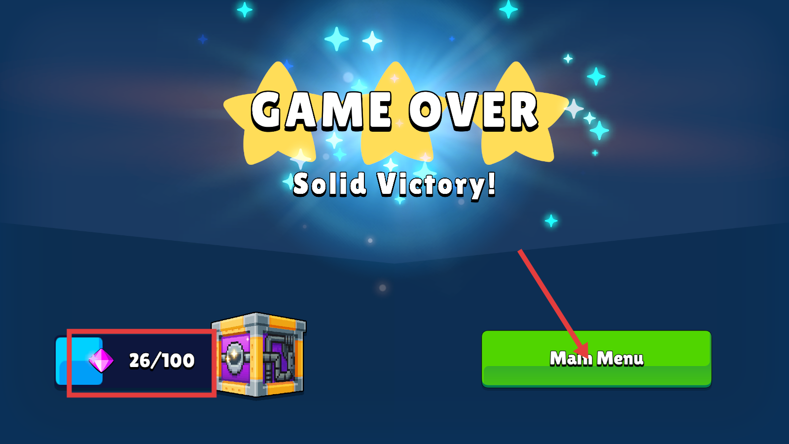 4、获胜后查看【26/100】钻石进度,领取宝箱,点击【Main-Menu】返回主界面,筹备下一场战斗。
