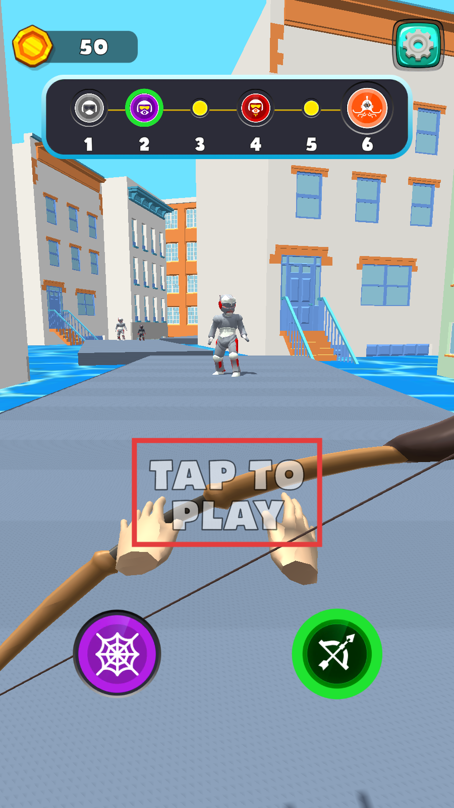 1、游戏开局点击【TAP-TO-PLAY】启动,留意上方阶段标识,熟悉弓箭与技能按键布局。