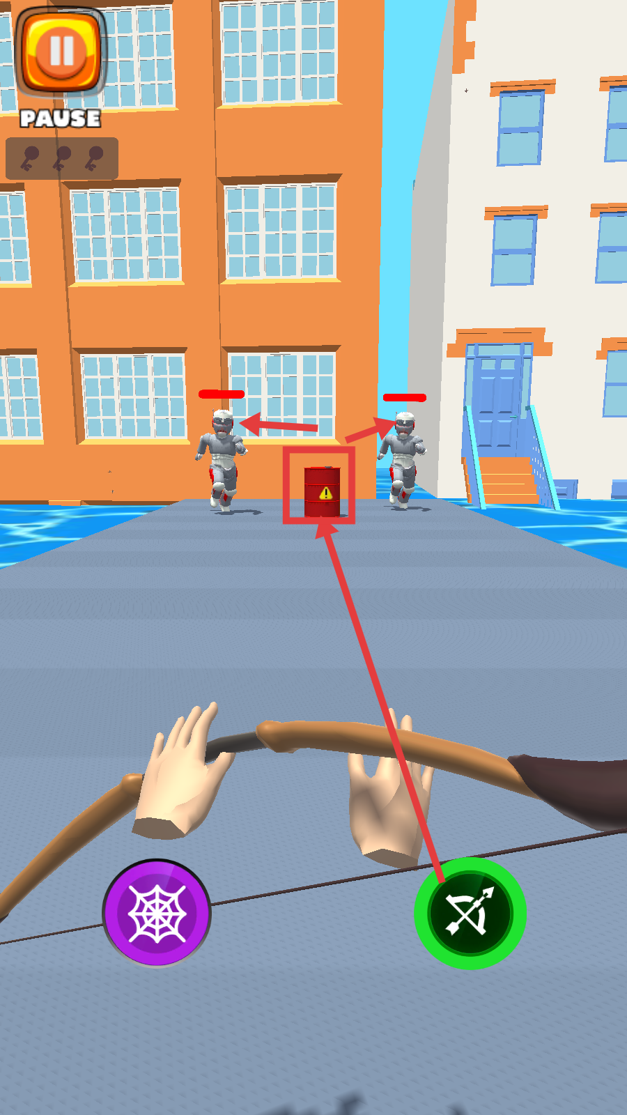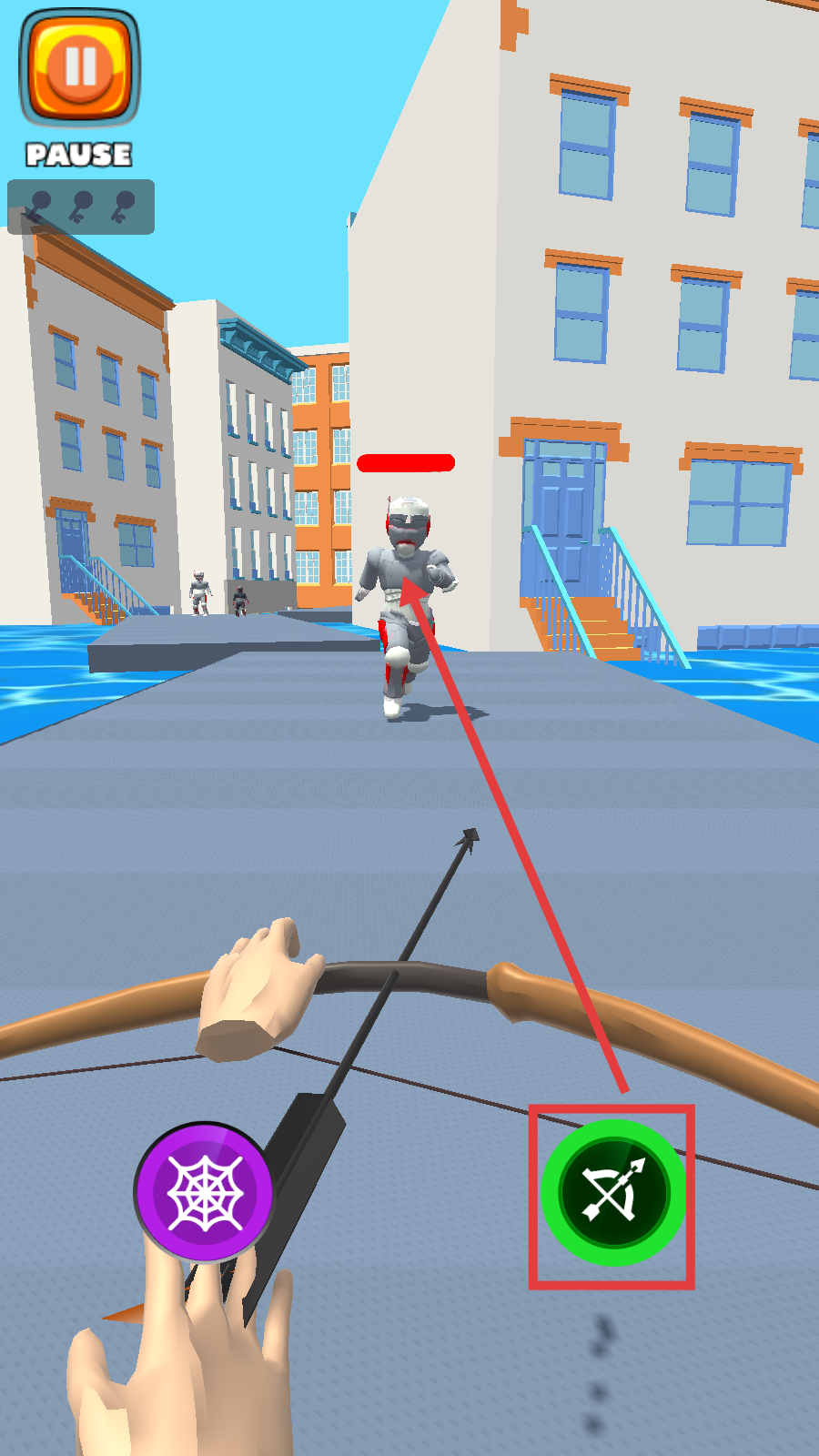 2、瞄准敌人时长按调整弹道,时机成熟点击【绿色-弓箭按钮】射击,消耗目标血量。