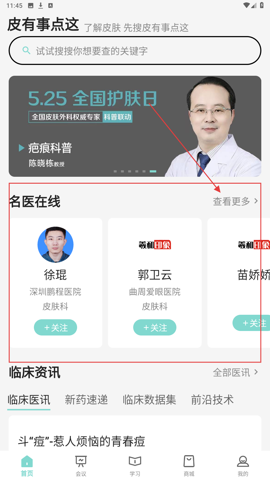 1、在【皮有事点这】首页,点【名医在线-查看更多】,浏览更多皮肤科名医。