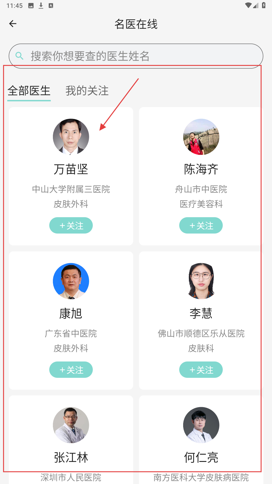 2、进入【名医在线】页,找想关注的医生,如【万苗坚】,点【+关注】追踪动态。