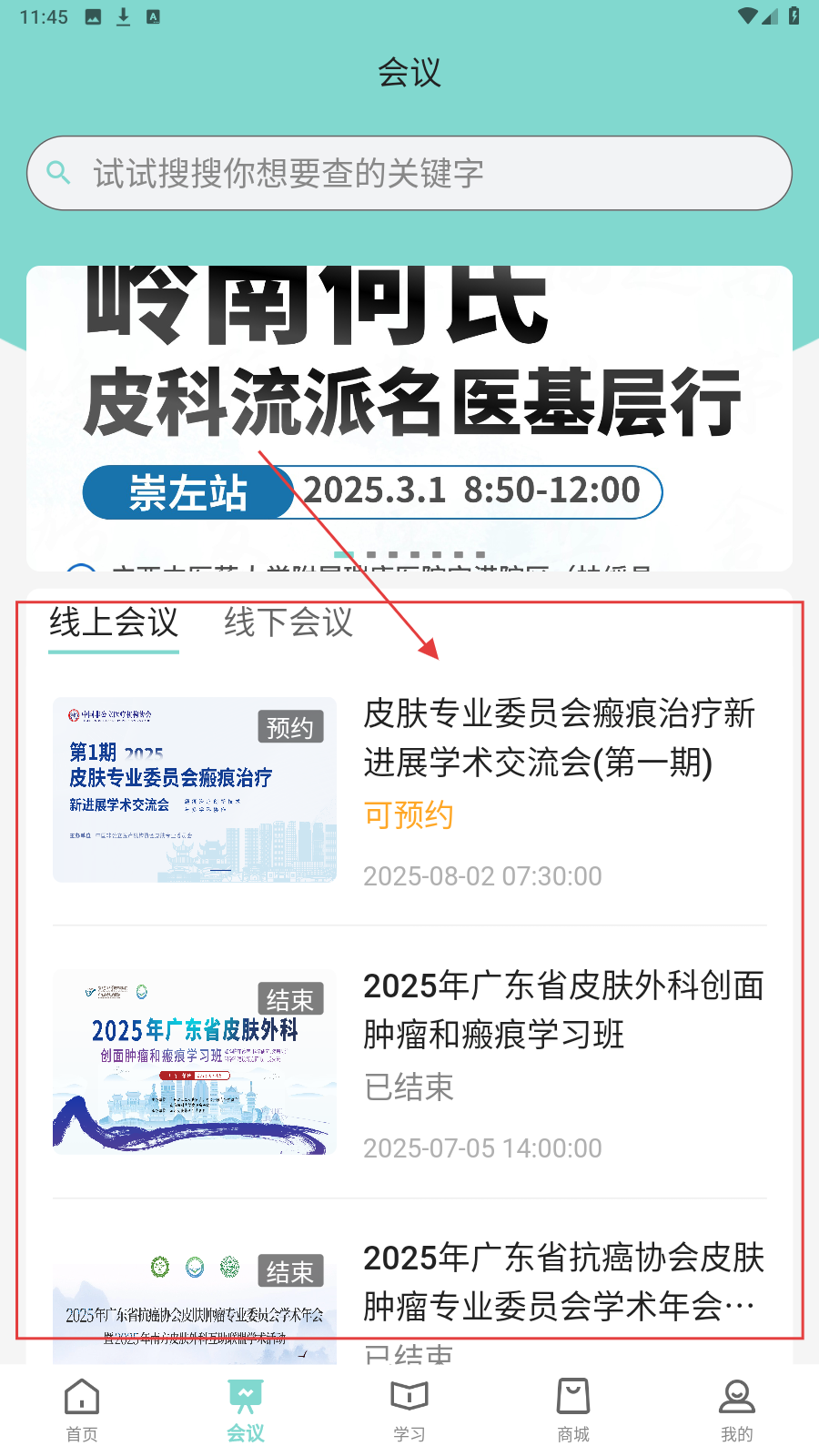 3、切换【会议】页,选感兴趣会议,如【皮肤专业委员会瘢痕治疗交流会】,点进详情。