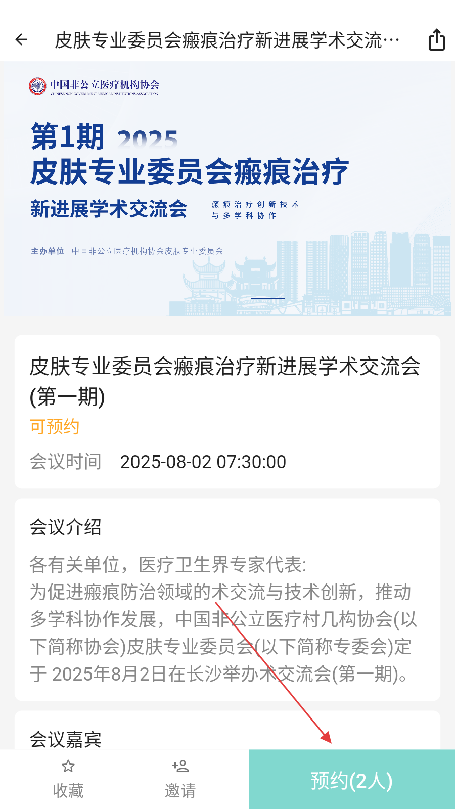 4、查看会议详情后,确认参与点【预约(2人)】,报名学术交流活动。