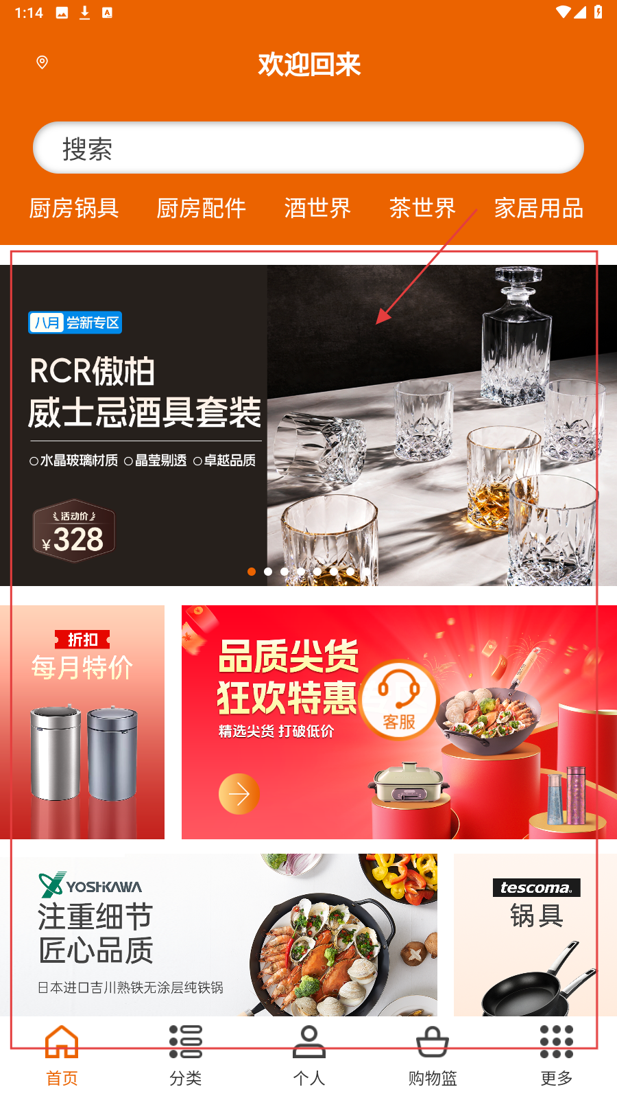 1、首页逛【八月尝新专区】,点【RCR傲柏威士忌酒具套装】,查看商品详情。