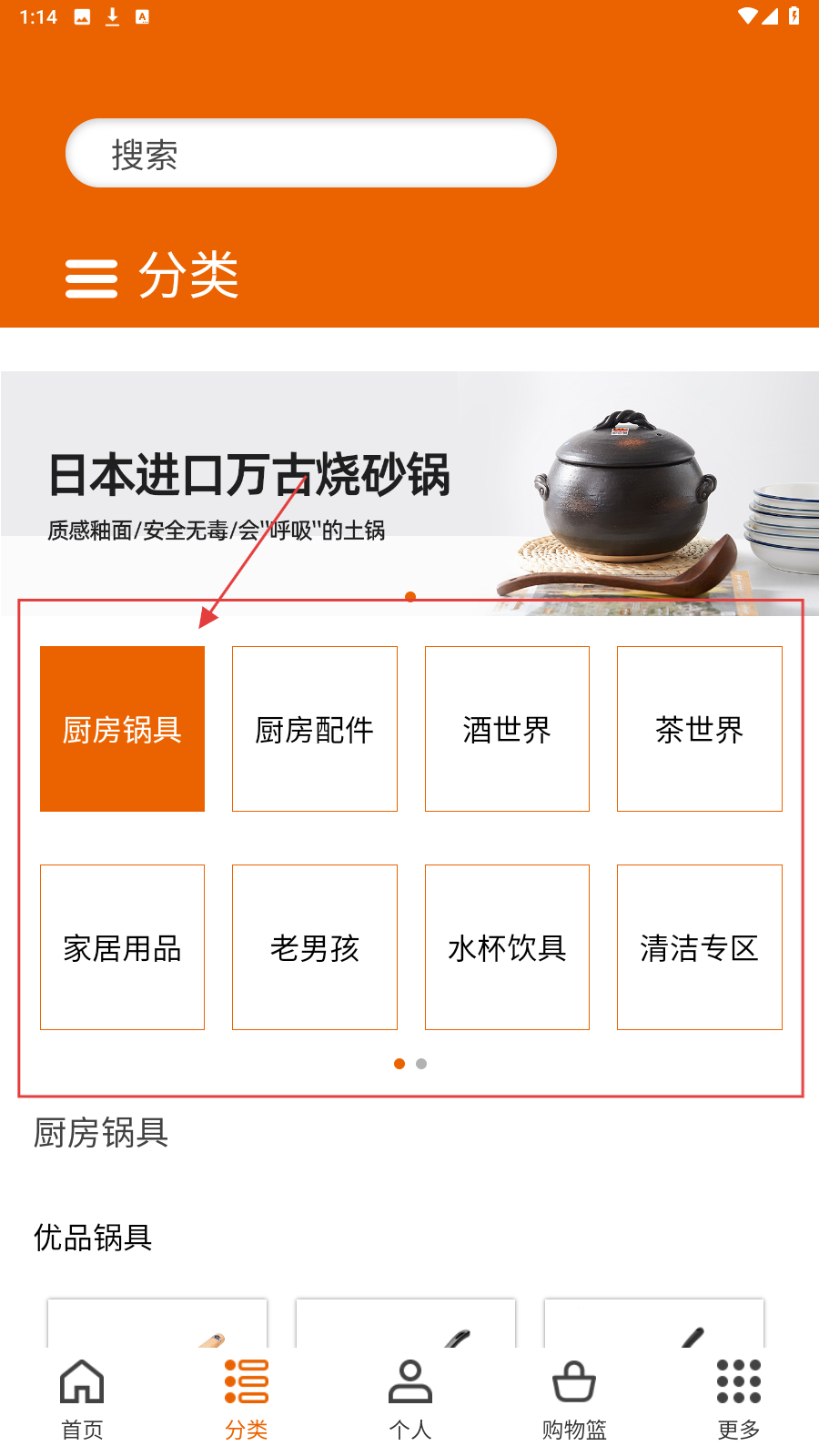 3、切换【分类】页,选【厨房锅具】,浏览日本进口万古烧砂锅等商品。