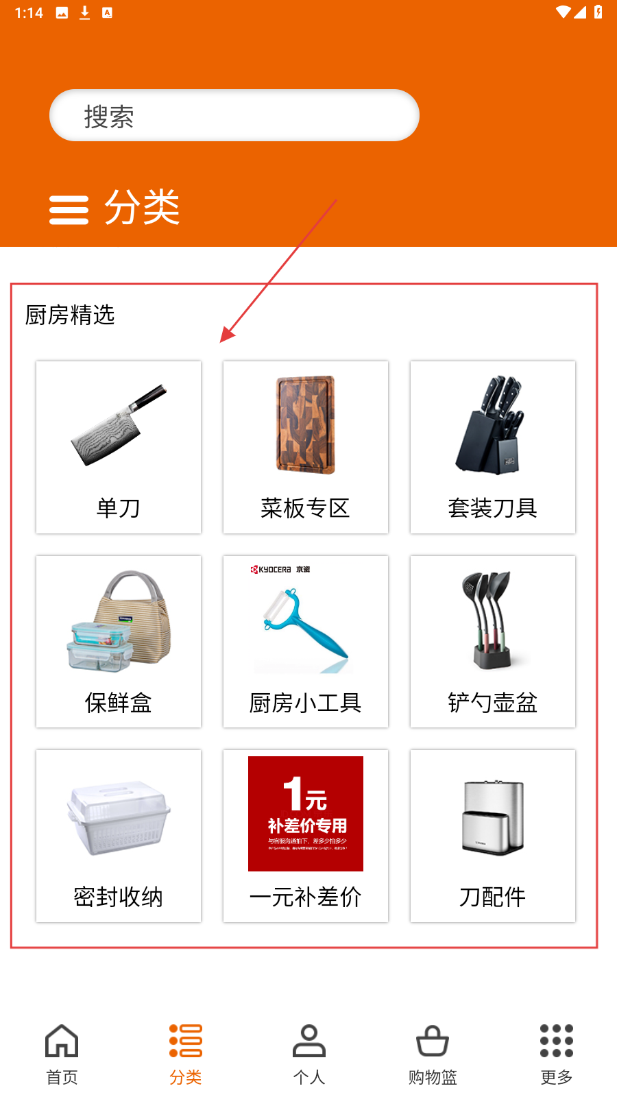 4、进入【厨房精选】分类,按需选单刀、菜板等,精准找厨房用品。