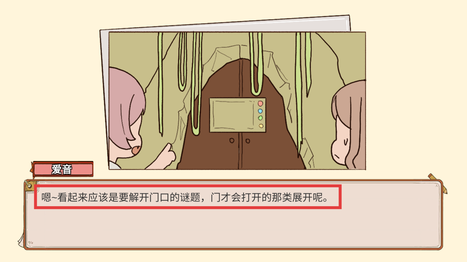 2、剧情中抵达洞穴,按【爱音】提示,聚焦门口三色谜题,破解后开启新区域推进故事。