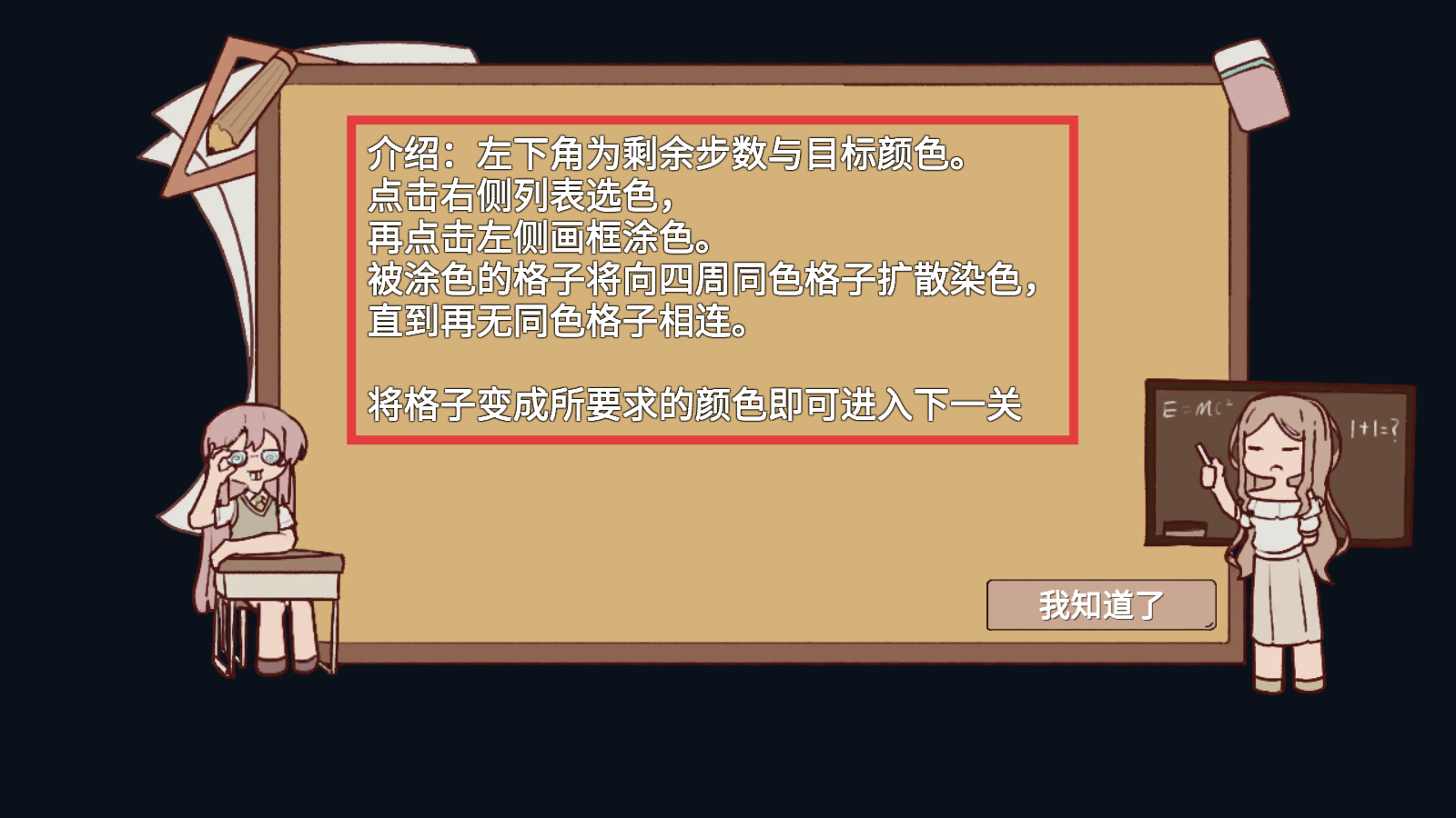 3、学习染色规则:选右侧颜色,点击画框涂色,同色格子会扩散,在剩余步数内达成目标色。