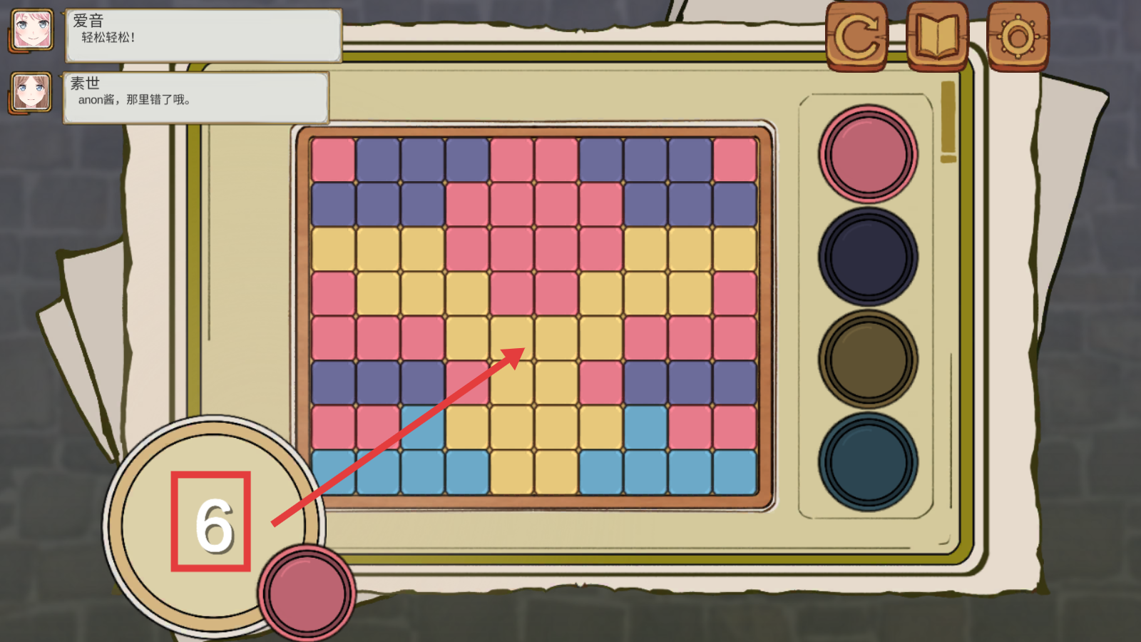4、关卡内关注左下角【6】剩余步数,选色后点击黄色格子,借扩散染色,修正错误完成挑战。