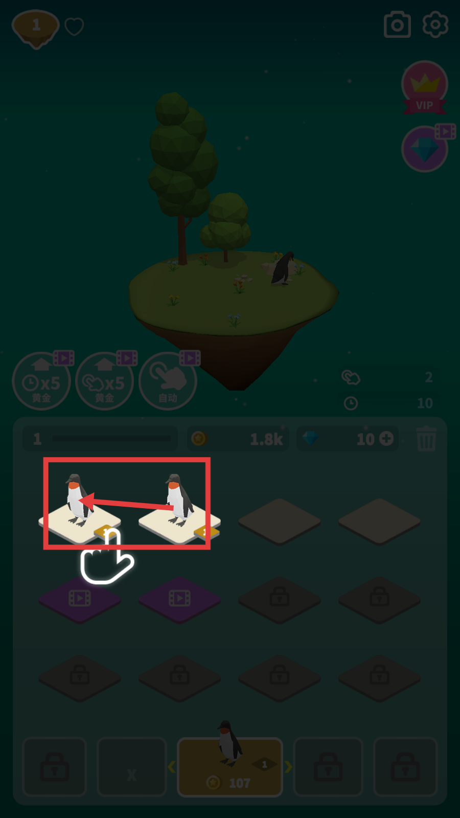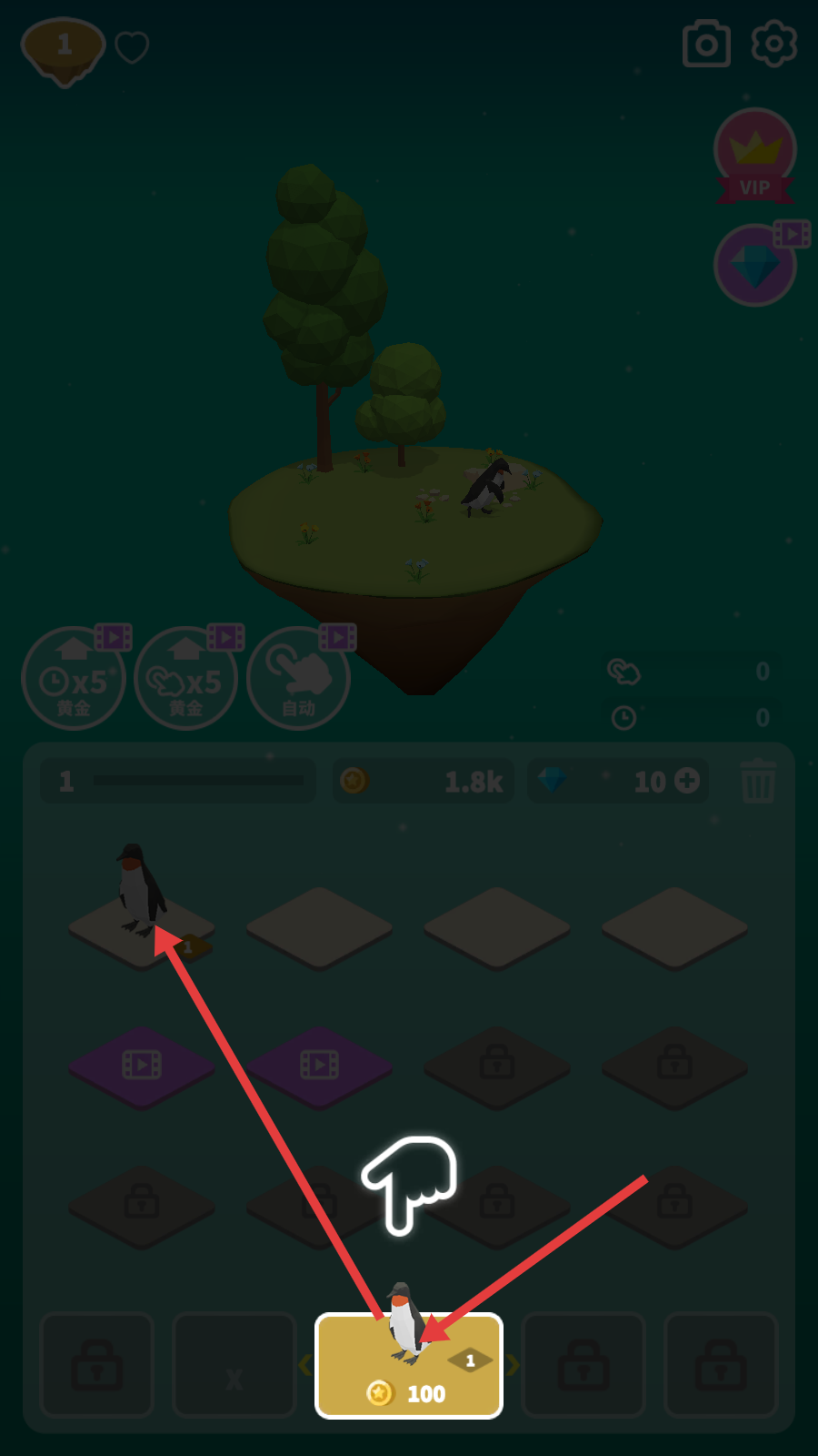 1、点击底部【100-金币】图标,在空格里放置企鹅,解锁岛屿动物,积累基础资源推进养成。
