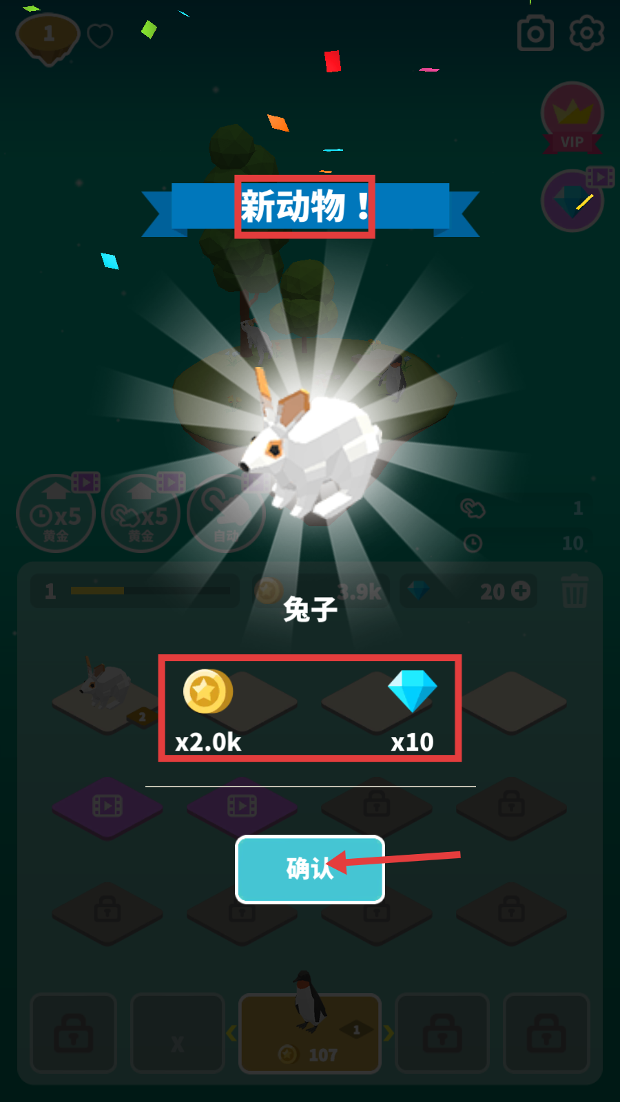 3、解锁【新动物-兔子】时,领取【x2.0k-金币】【x10-钻石】奖励,点击【确认】按钮,充实资源库。