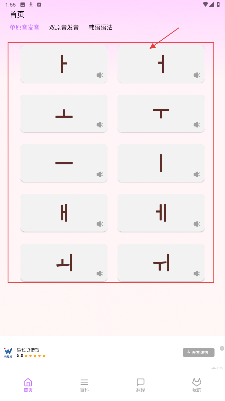 1、首页选韩语单原音,点击字符卡片,听发音学基础字母。
