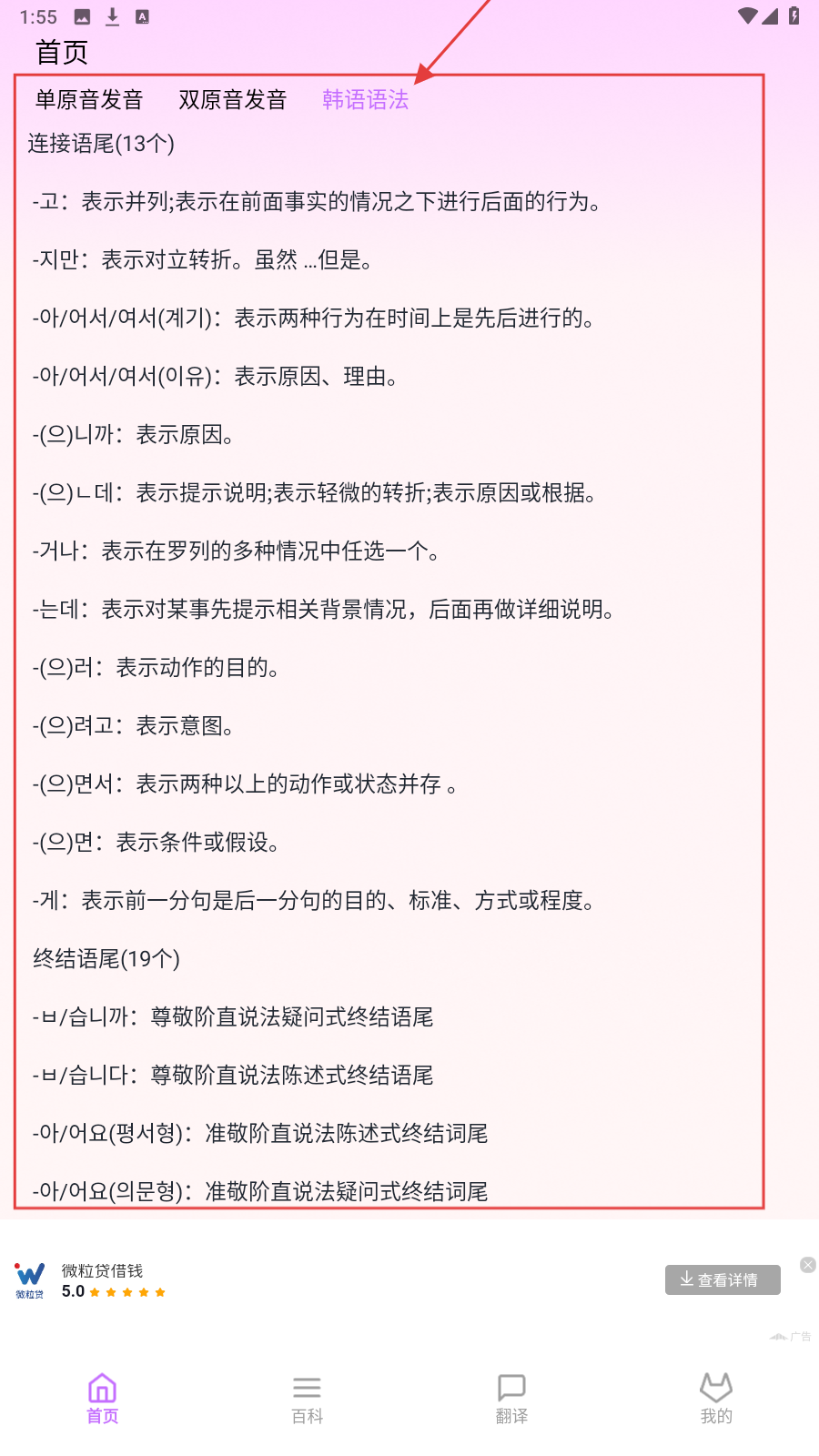 2、切换【韩语语法】,浏览连接语尾、终结语尾等语法知识。