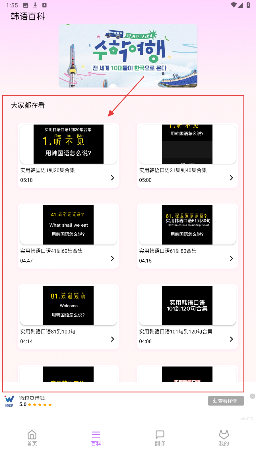 3、进入【百科】页,选实用韩语口语合集,如1-20集,学日常表达。