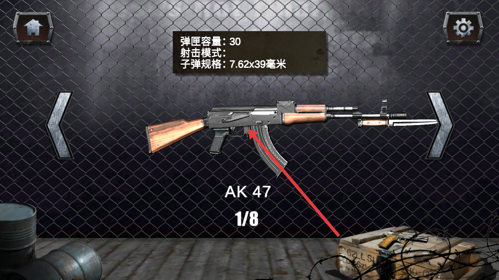 1、查看【AK-47】属性,其【弹匣容量-30】【子弹规格-7.62x39毫米】,熟悉初始武器信息。