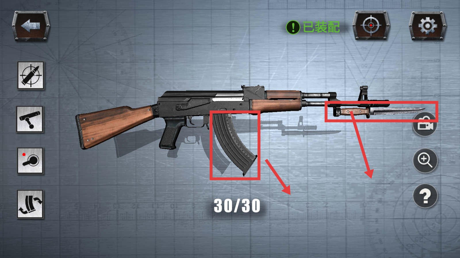 2、装配【AK-47】时,确保弹匣【30/30】满弹,加装刺刀配件,确认【已装配】状态。