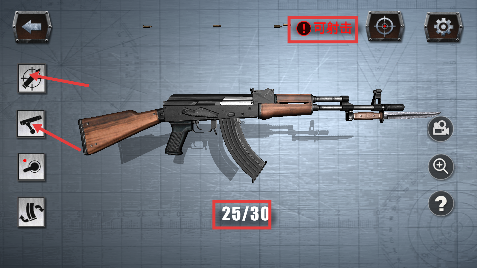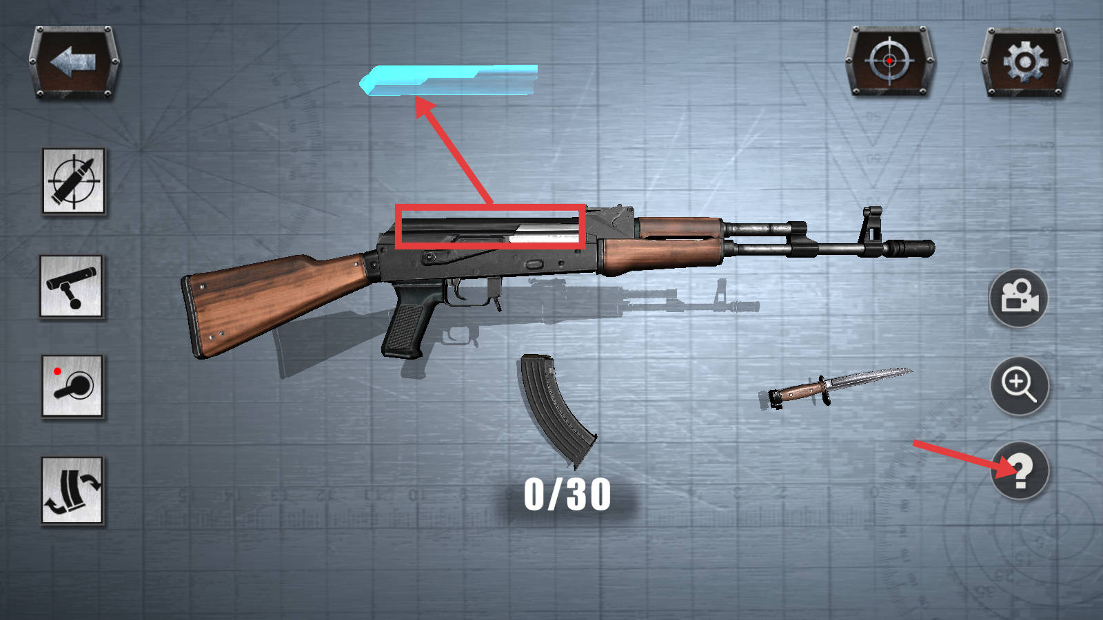 3、拆卸AK47配件,卸下弹匣与刺刀后,点击右侧【?】按钮,查阅分解操作指引。