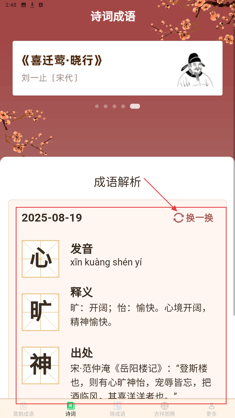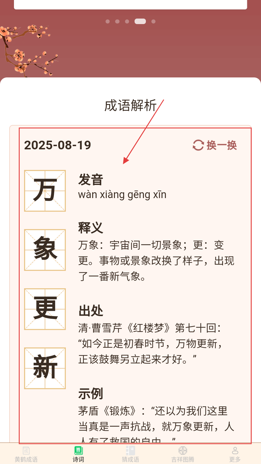 1、进入【诗词成语】页,点【换一换】,切换成语解析内容。