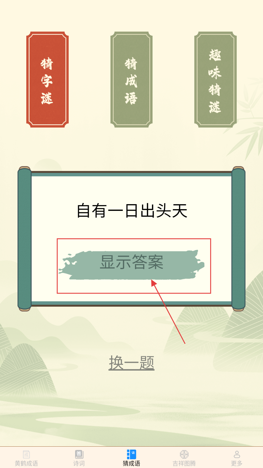 3、切换【猜成语】页,遇谜题点【显示答案】,获取谜底。