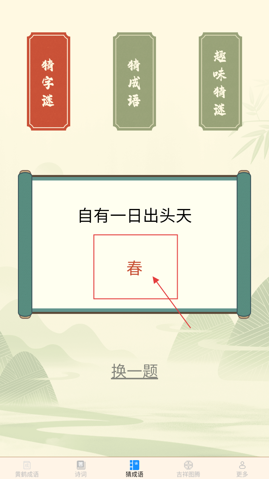 4、看谜底后,点【换一题】,挑战新的猜成语谜题。