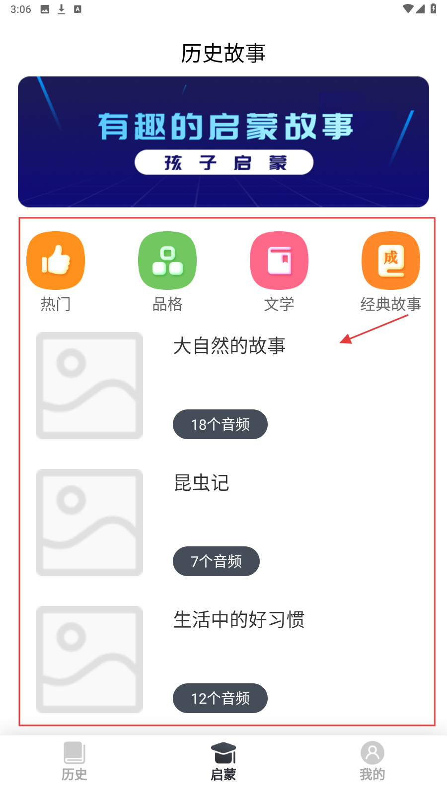 3、切换【启蒙】页,选择心仪的故事,进行故事收听。